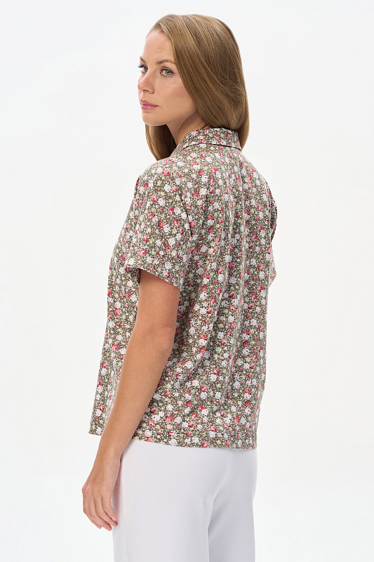 Блузка из кулирки качества ПЕ 150 гр Модель новой формы, свободная, укороченная, отложной воротник, застёжка на пуговицы, спущенное плечо, короткие цельнокроенные рукава. Приятная, комфортная модель на жаркие дни, благодаря рисунку и силуэту выглядит женственно. Рост модели 175 см.