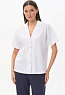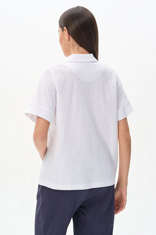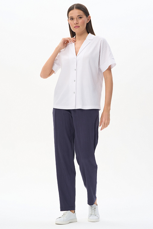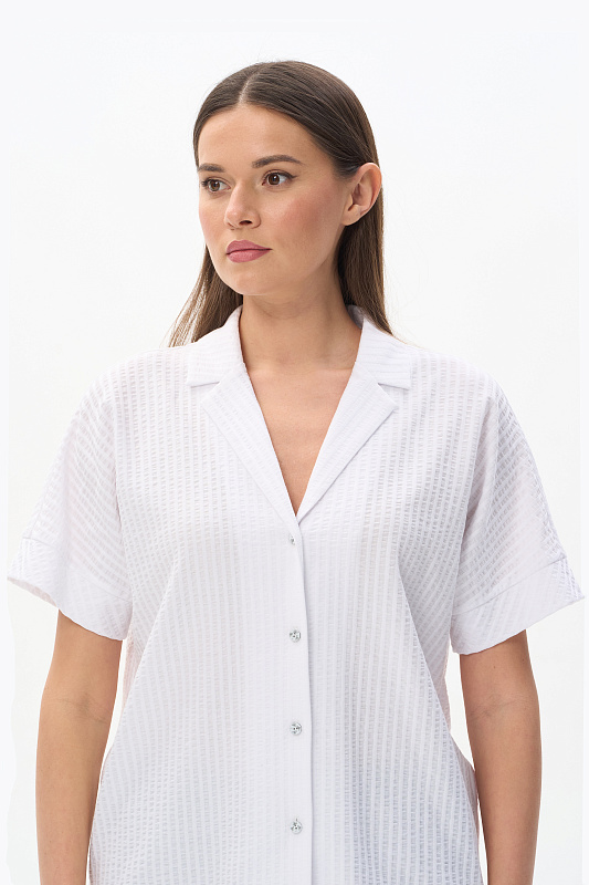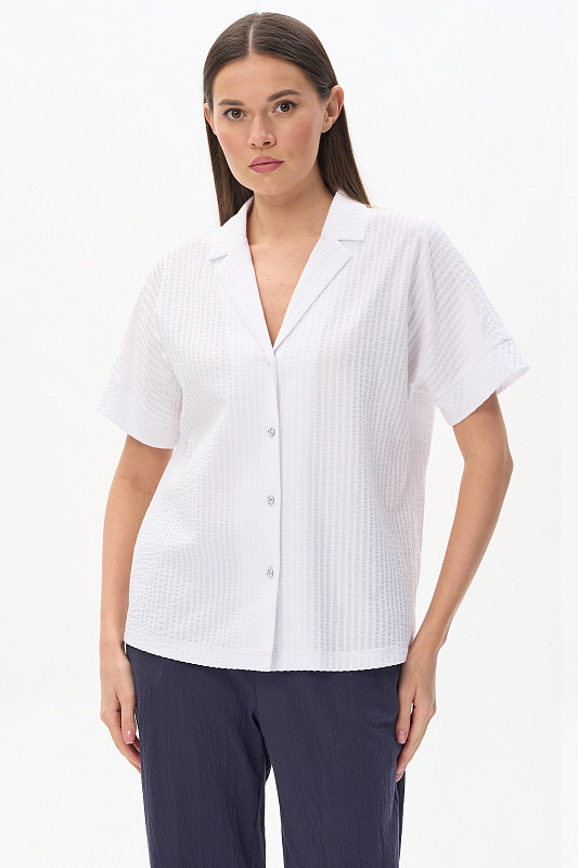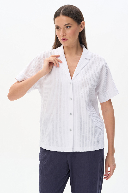 Блузка из хлопкового полотна с эффектом жатости качества ПЕ 180 гр в чистом белом оттенке. Модель новой формы, свободная, укороченная, отложной воротник, застёжка на пуговицы, спущенное плечо, короткие цельнокроеные рукава. Приятная, комфортная модель на жаркие дни, благодаря фактуре и силуэту выглядит свежо и актуально. Рост модели 175 см.
