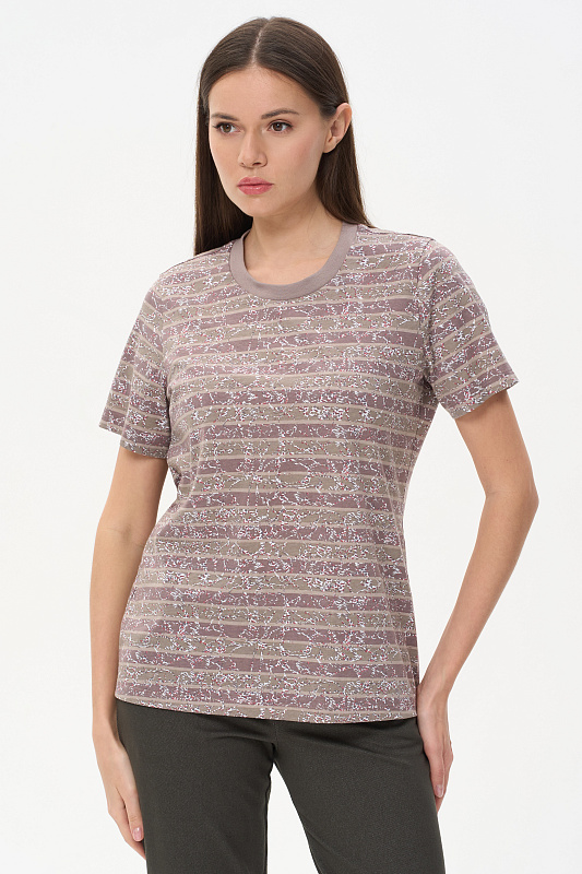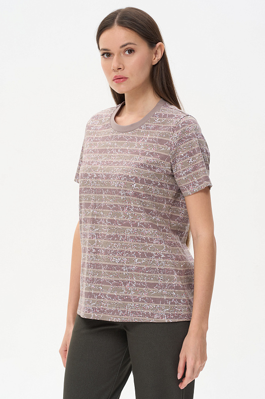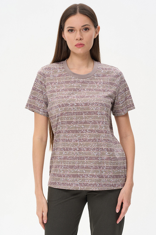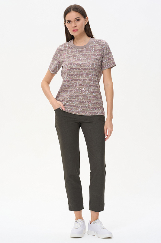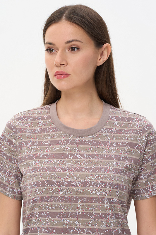 Футболка модного кроя из хлопкового трикотажного полотна. Свободный силуэт, длина до середины бёдер, втачные рукава. Круглый вырез горловины обработан хлопковым полотном рибана. Рост модели 175 см.
