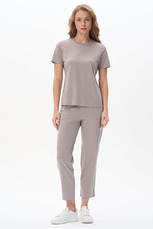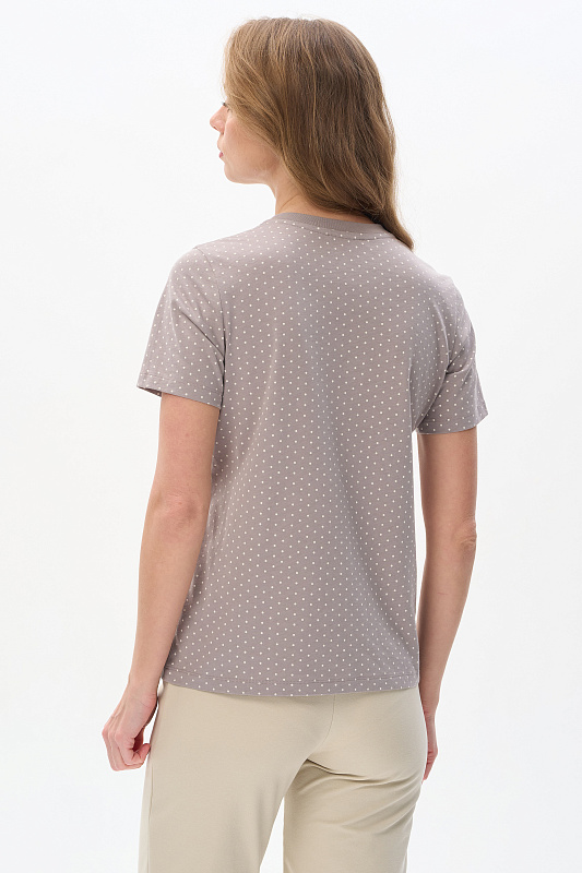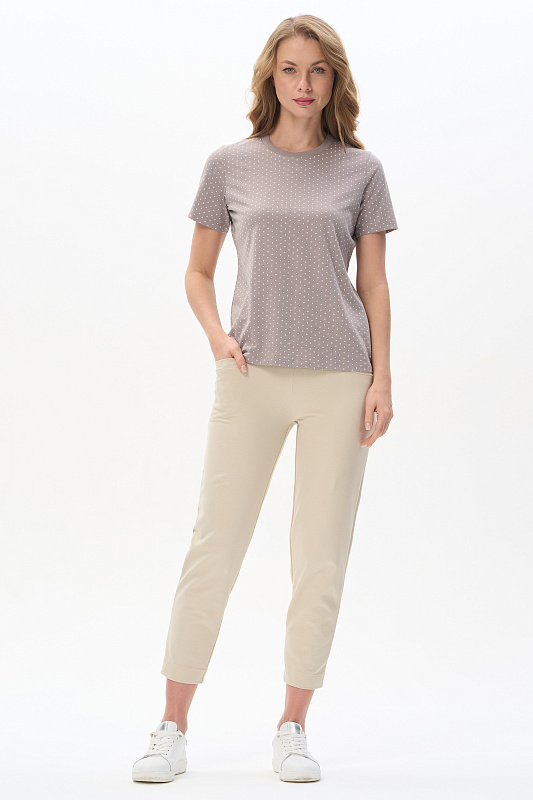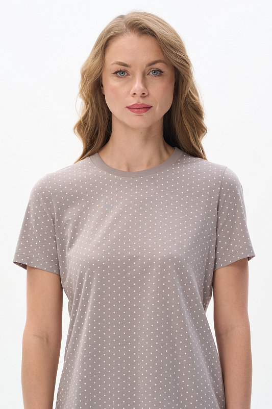 Футболка из кулирки качества пенье 145 гр, Горошки в Сливочном оттенке на фоне Перламутровое облако. Модель модного кроя, прямого силуэта, длина до середины бёдер, втачные короткие рукава. Круглый вырез горловины обработан хлопковой рибаной. Универсальная модель с комфортным прилеганием. Рост модели 175 см.