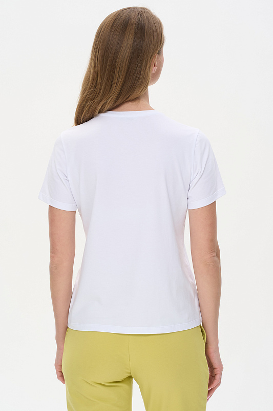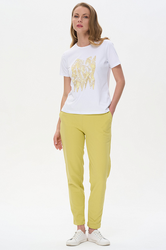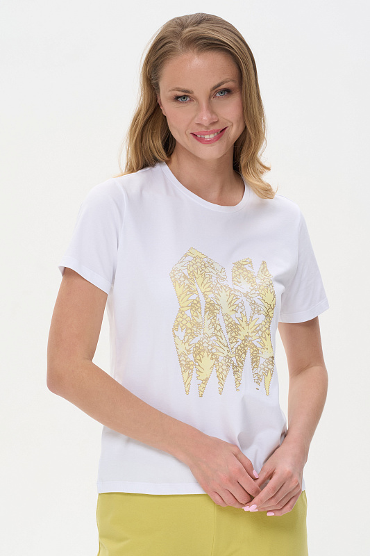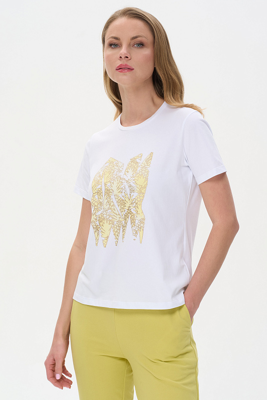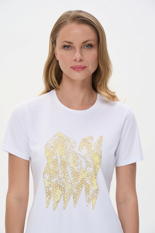 Белая футболка из хлопкового полотна качества пенье 150 гр. Модель с круглым вырезом горловины и цельнокроеными короткими рукавами с подворотом. Принт - растительная абстракция в трендовом оттенке с эффектом золота выглядит актуально и сделает ваш образ привлекательным. Рост модели 175 см