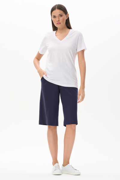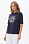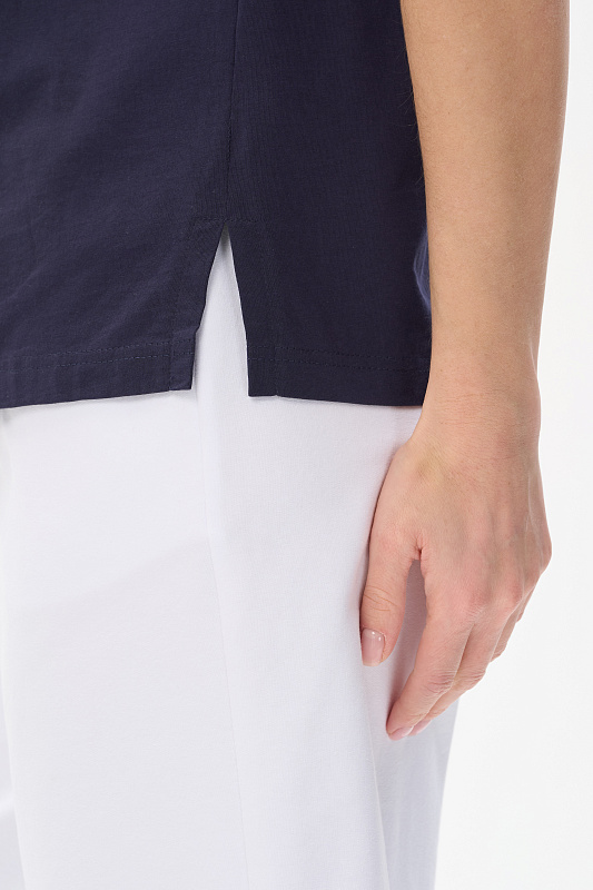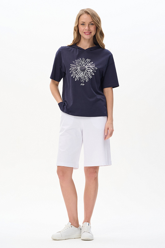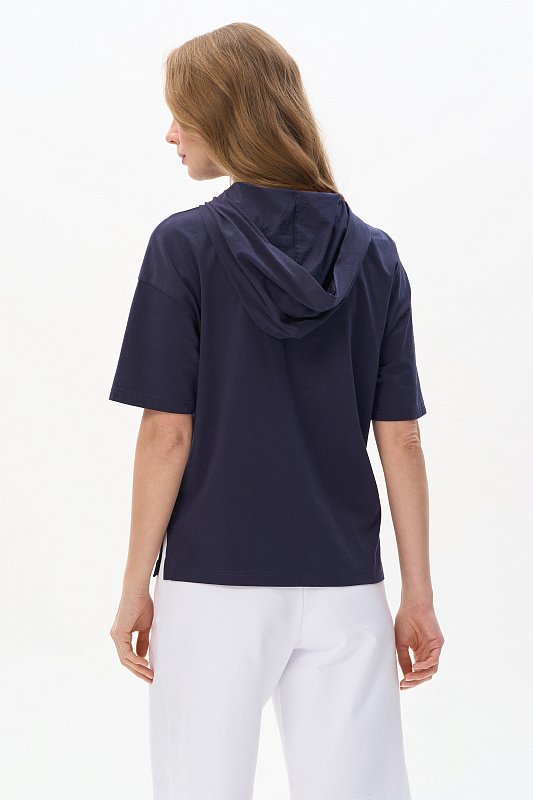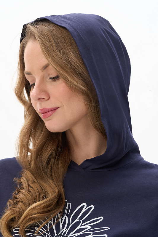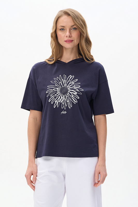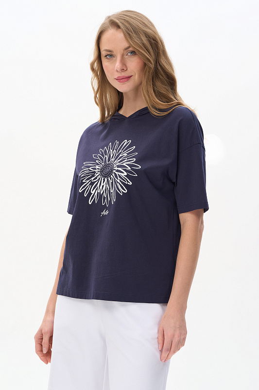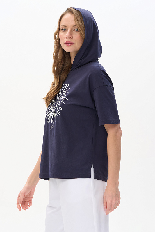 Футболка с капюшоном из кулирки качества ПЕ 150 гр в глубоком синем оттенке. Модель свободная, прямого силуэта, с контрастной печатью на полочке, втачные рукава до локтя, по бокам разрезы. Это универсальный и стильный предмет гардероба, который подойдет для женщин всех возрастов и размеров. Футболку можно сочетать с различными предметами одежды, создавая стильные и комфортные образы. Рост модели 175 см.