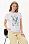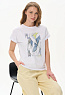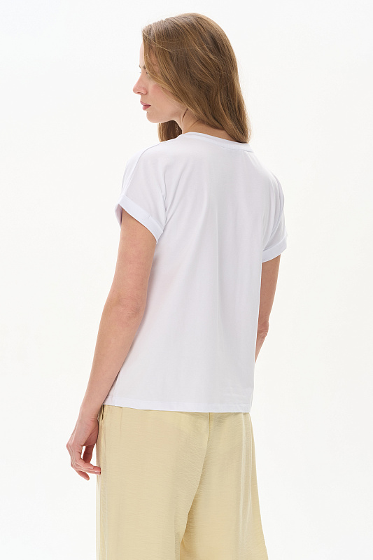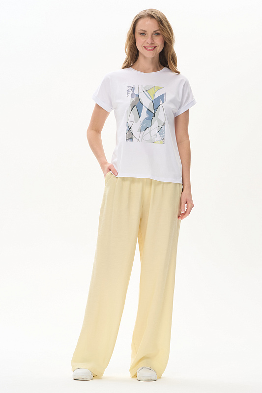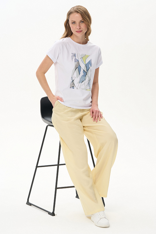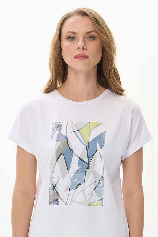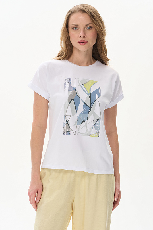 Белая футболка из хлопкового полотна качества пенье 165 гр. Модель с круглым вырезом горловины и цельнокроеными короткими рукавами с подворотом, Принт - витражная абстракция. Благодаря такой печати модель выглядит особенно эффектно, легко комбинируется со многими брюками и юбками коллекции. Рост модели 175 см.
