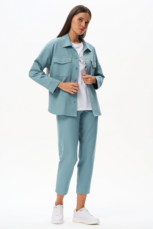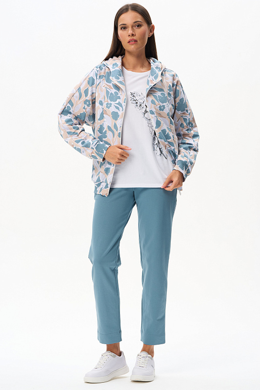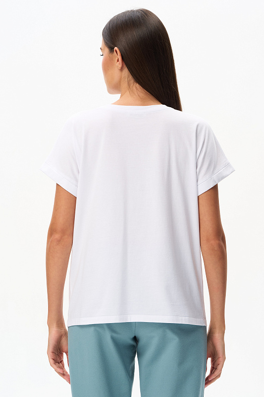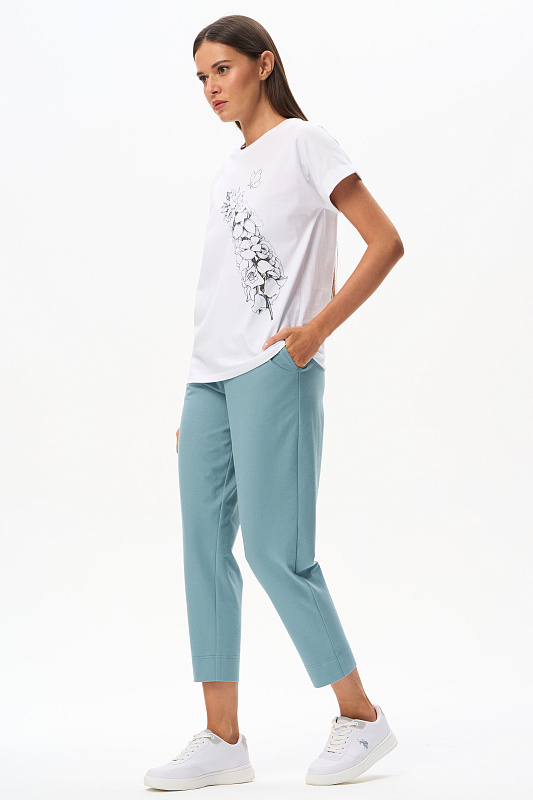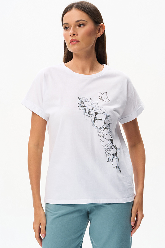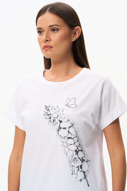 Футболка из кулирки пенье чистого белого оттенка. Модель с круглым вырезом горловины с отделкой из рибаны и цельнокроеными короткими рукавами с подворотом. На футболке "расцветает" красивый принт Дельфиниума в ботаническом стиле. Сочетается со многими брюками коллекции. Рост модели 175 см.