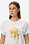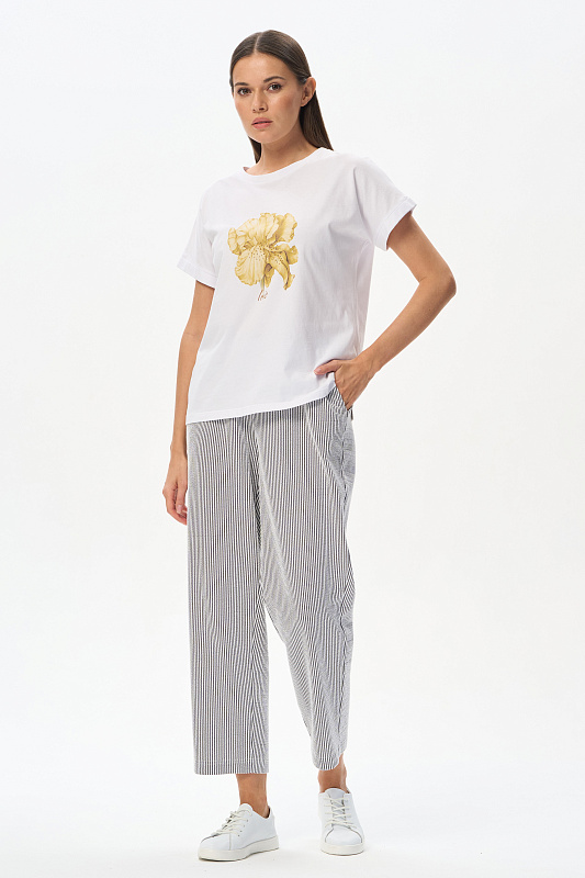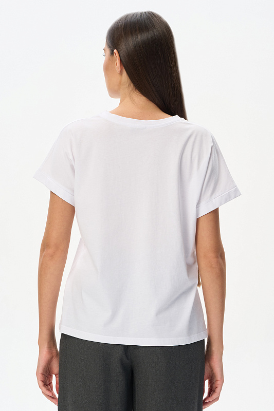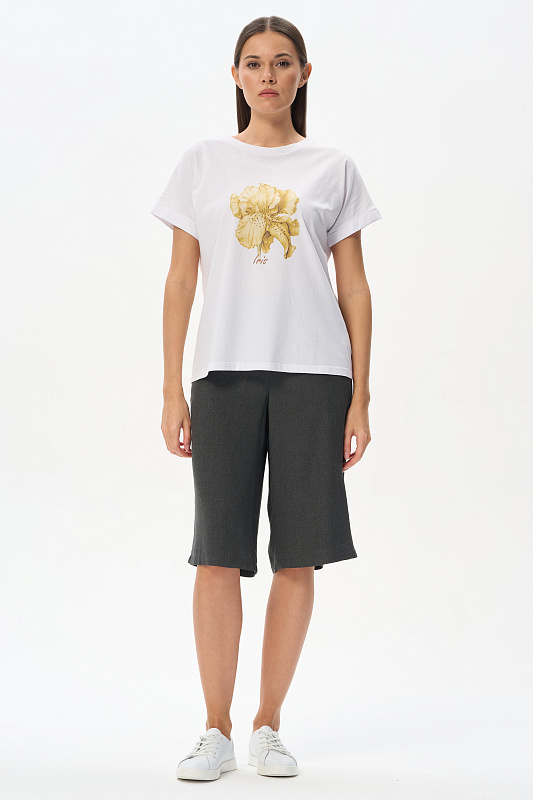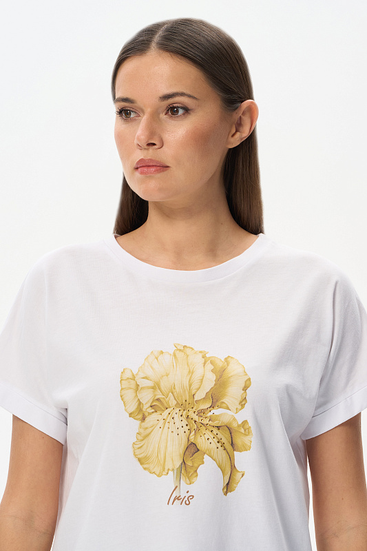 Белая футболка из хлопкового полотна качества пенье 150 гр. Модель с круглым вырезом горловины и цельнокроеными короткими рукавами с подворотом. Нежный ирис украшен блеском страз. Благодаря такой печати модель выглядит особенно эффектно и сделает ваш образ нарядным. Рост модели 175 см