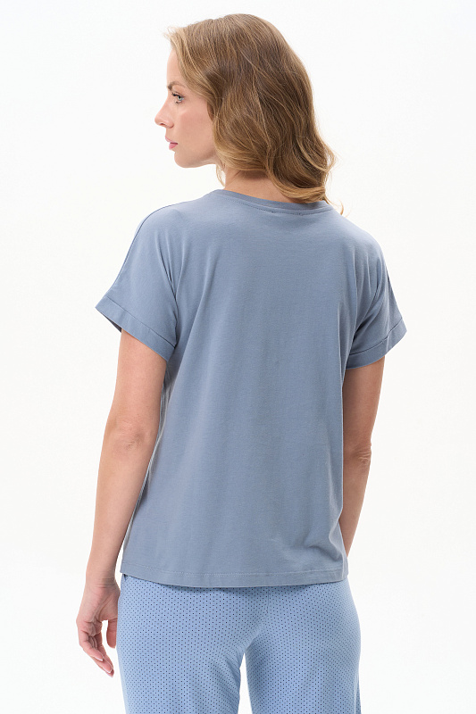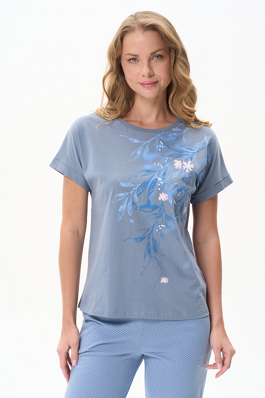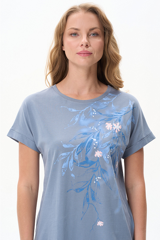 Футболка с принтом из хлопкового полотна качества пенье. Круглый вырез горловины окантован хлопковым полотном рибана. Цельнокроеные короткие рукава с отворотами. Рост модели на фото 178 см.