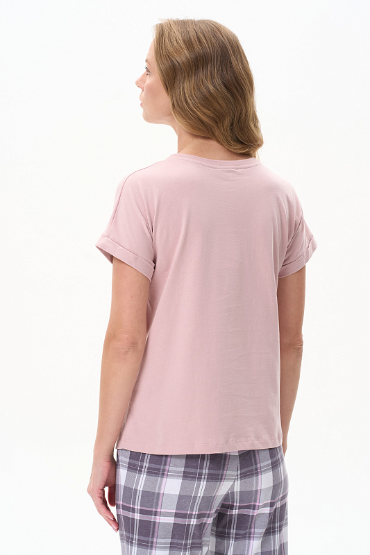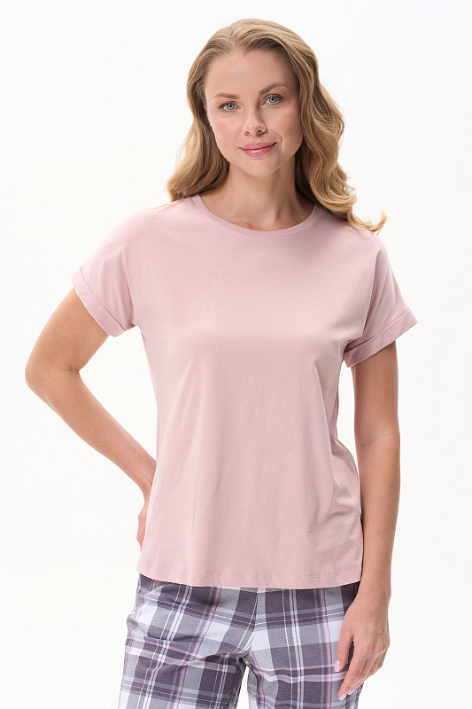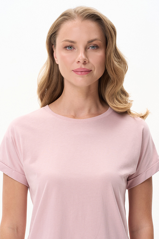 Футболка из хлопкового полотна качества пенье. Круглый вырез горловины окантован хлопковым полотном рибана. Цельнокроеные короткие рукава с отворотами. Рост модели на фото 177.