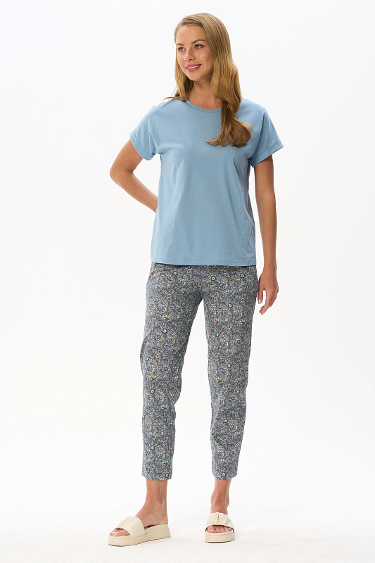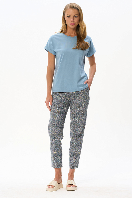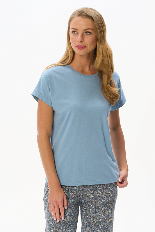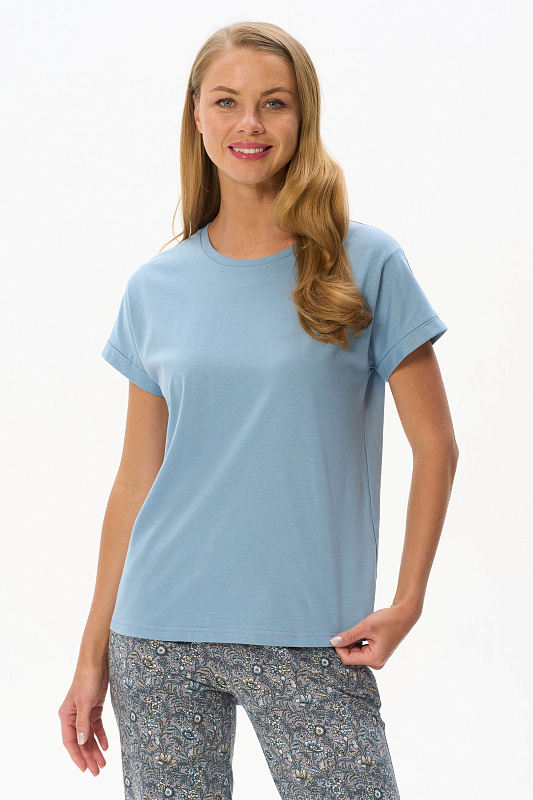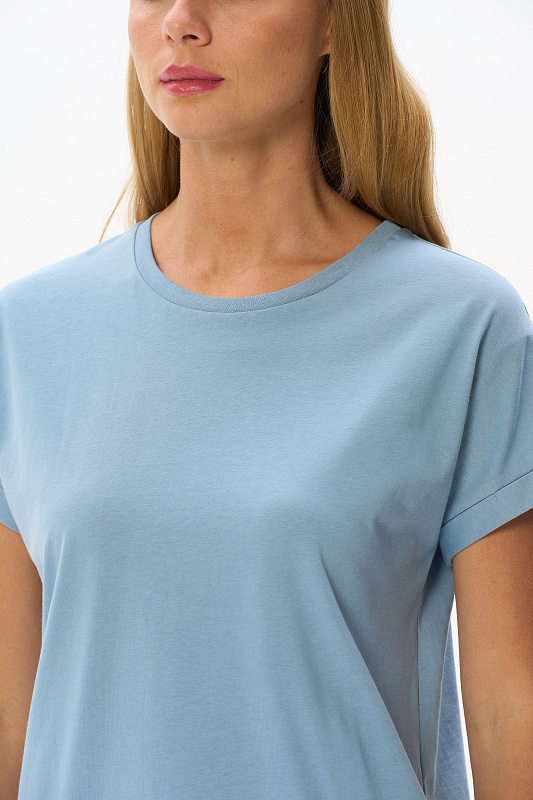 Футболка из хлопкового полотна качества пенье. Круглый вырез горловины окантован хлопковым полотном рибана. Цельнокроеные короткие рукава с отворотами. Рост модели на фото 178см.