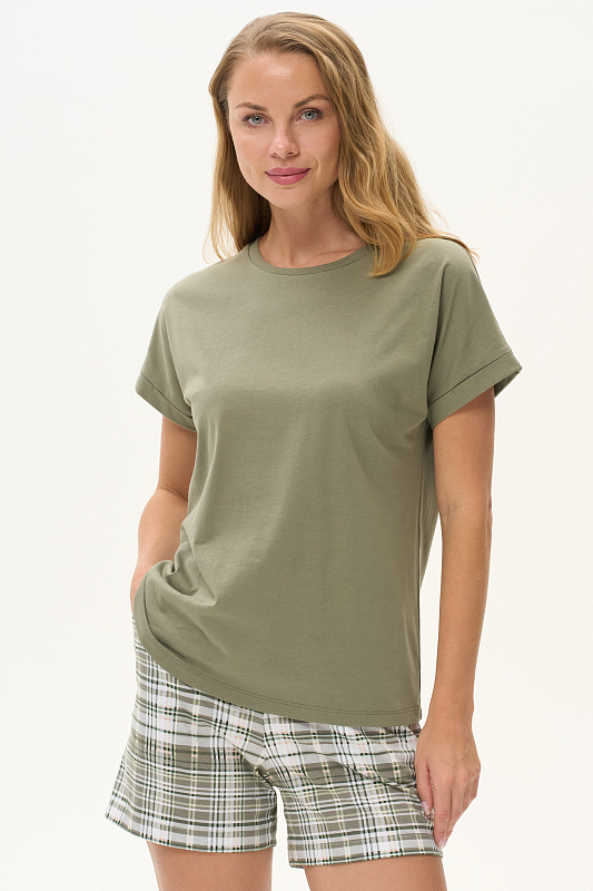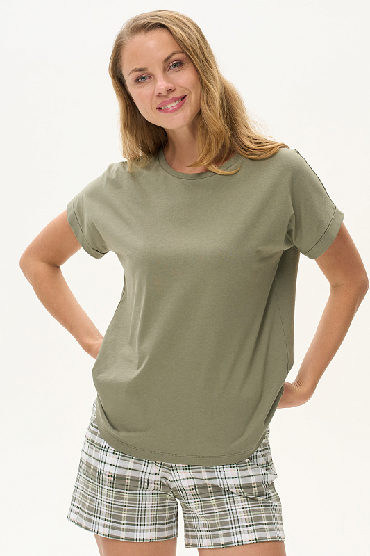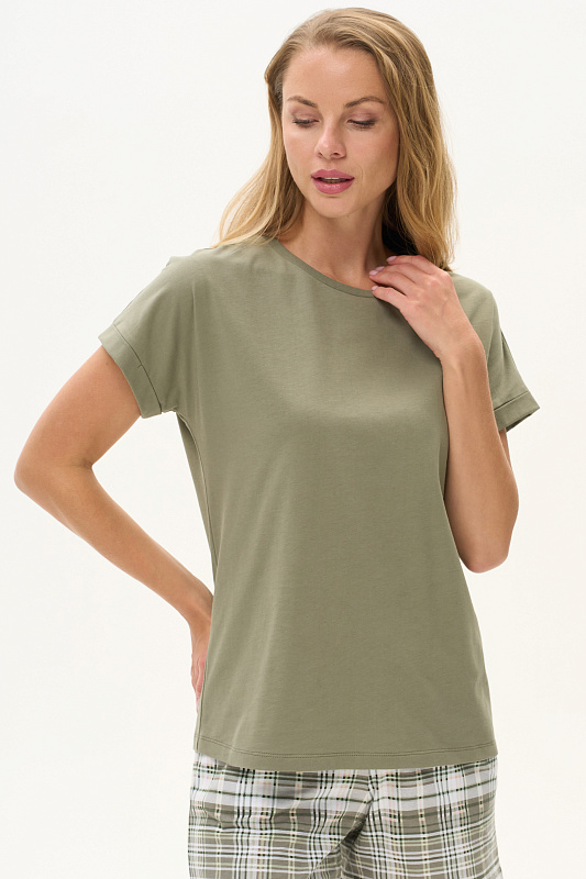 Футболка из хлопкового полотна качества пенье. Круглый вырез горловины окантован хлопковым полотном рибана. Цельнокроеные короткие рукава с отворотами. Рост модели на фото 178.