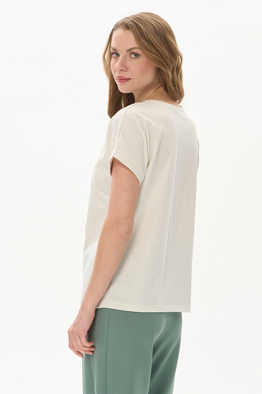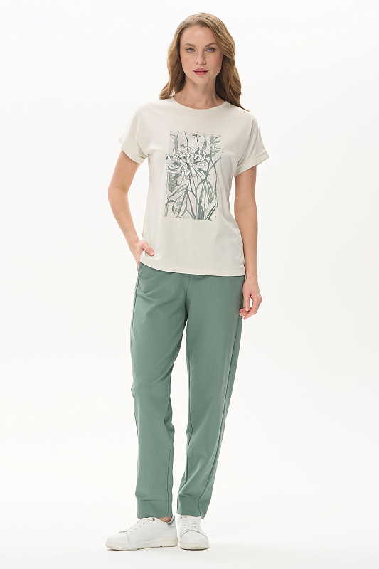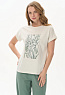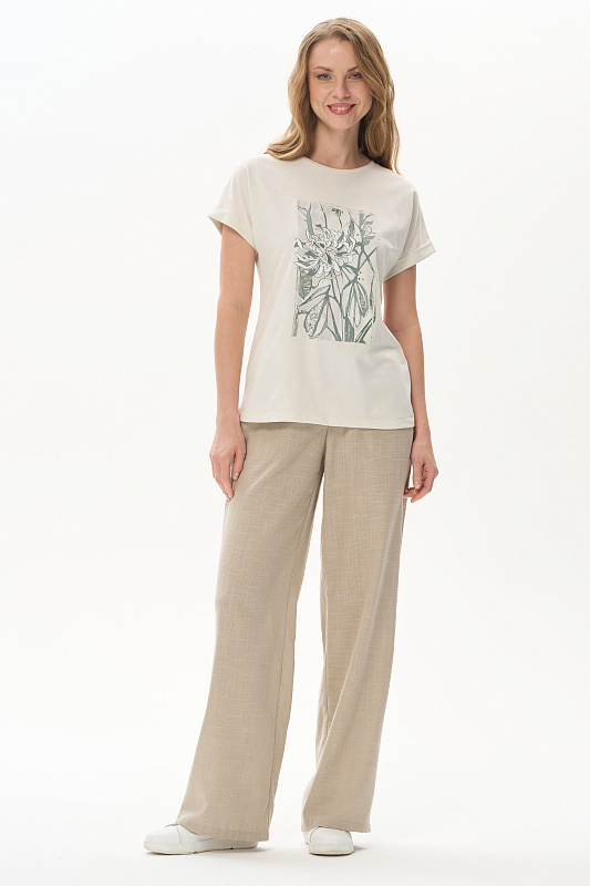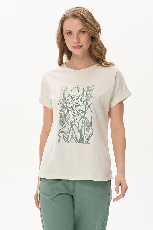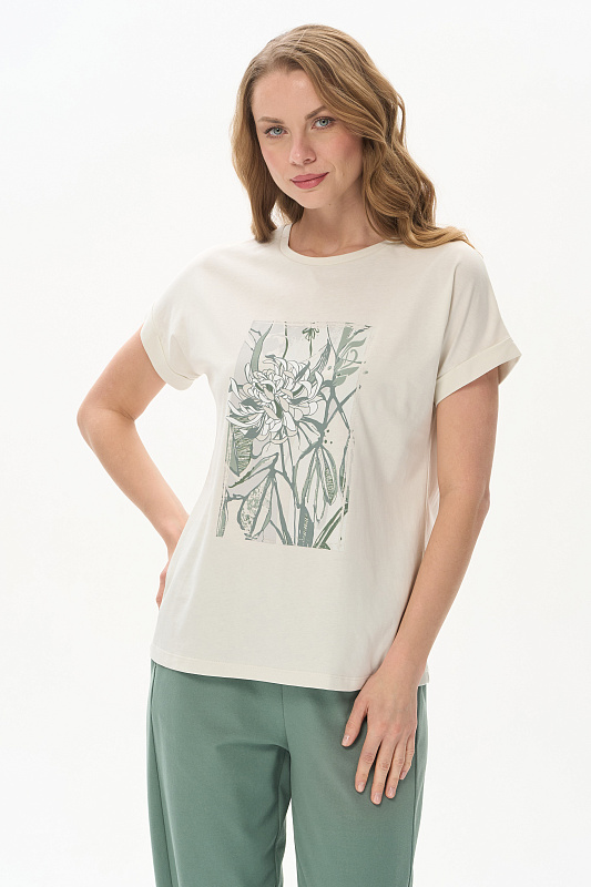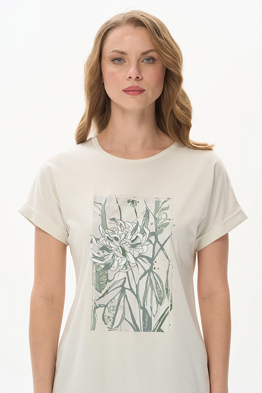 Футболка из кулирки качества пенье 150 гр.в серо-бежевом оттенке. Модель с круглым вырезом горловины и цельнокроеными короткими рукавами с зафиксированным подворотом. Принт - Цветок хризантемы в оттенках коллекции. Благодаря такой печати модель выглядит особенно эффектно и сделает ваш образ привлекательным. Рост модели 175 см