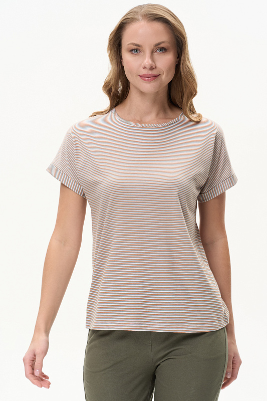 Футболка из хлопкового трикотажного полотна. Круглый вырез горловины, цельнокроеные короткие рукава с отворотами. Рост модели 175.