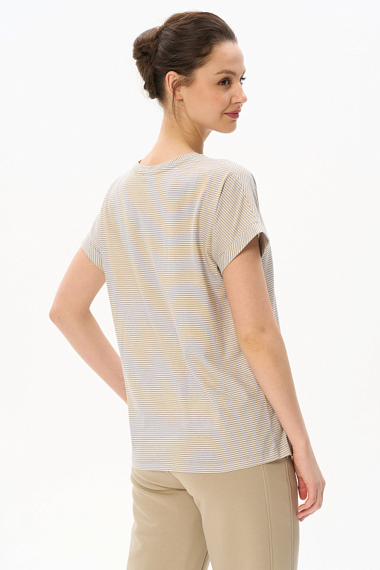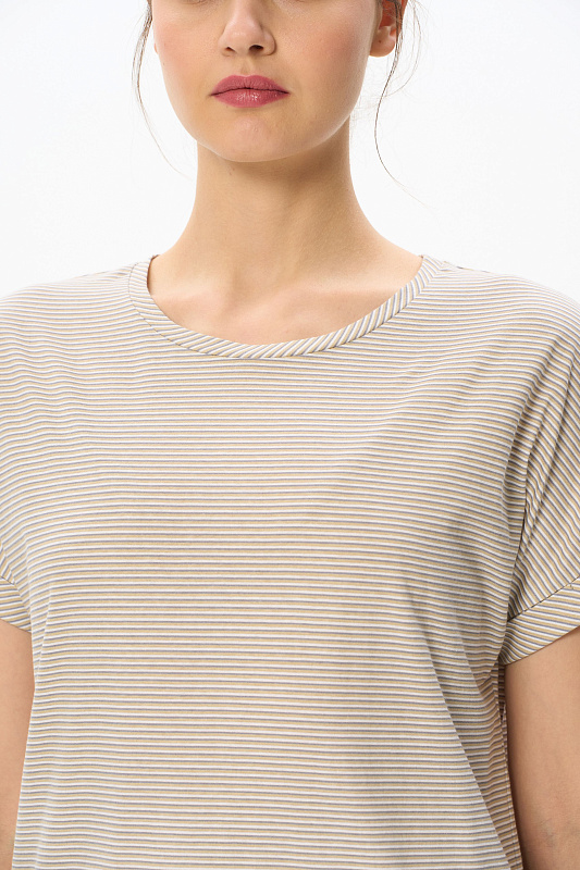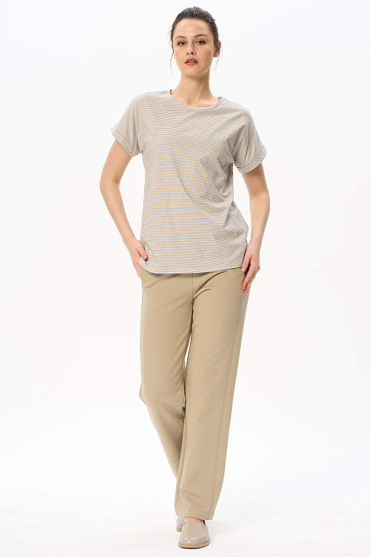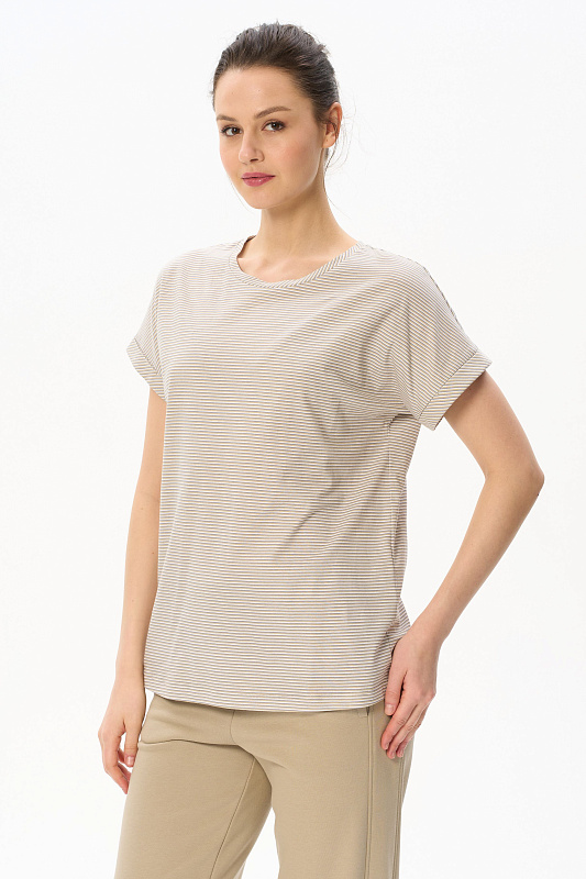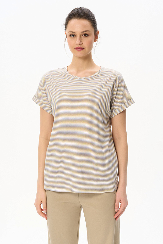 Футболка из хлопкового трикотажного полотна. Круглый вырез горловины, цельнокроеные короткие рукава с отворотами. Рост модели на фото 178см.