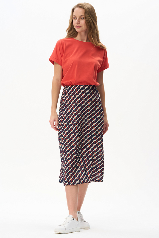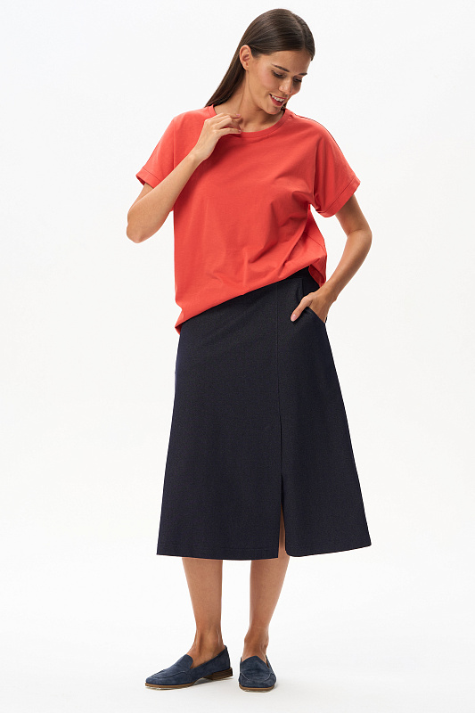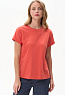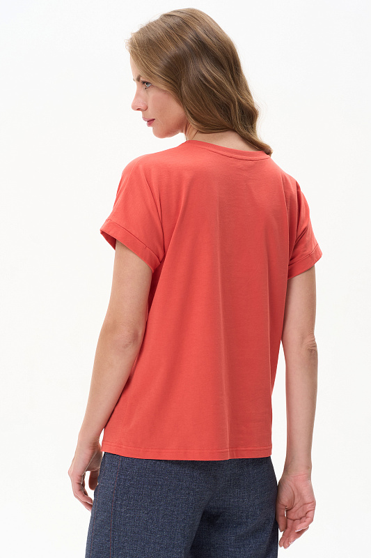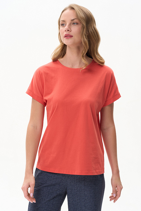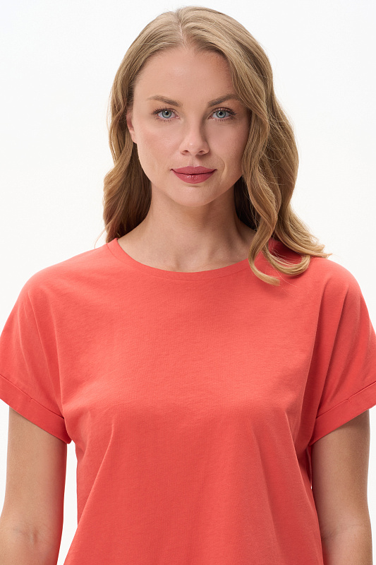 Повседневная базовая однотонная футболка трендового оттенка Грейпфрут из хлопкового полотна качества пенье. Модель с круглым вырезом горловины и цельнокроенными короткими рукавами с подворотом. Рост модели 175 см.