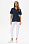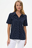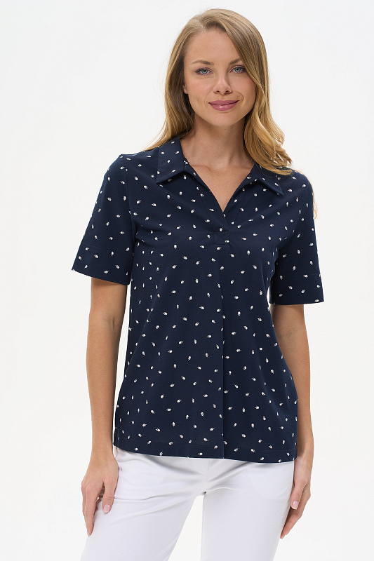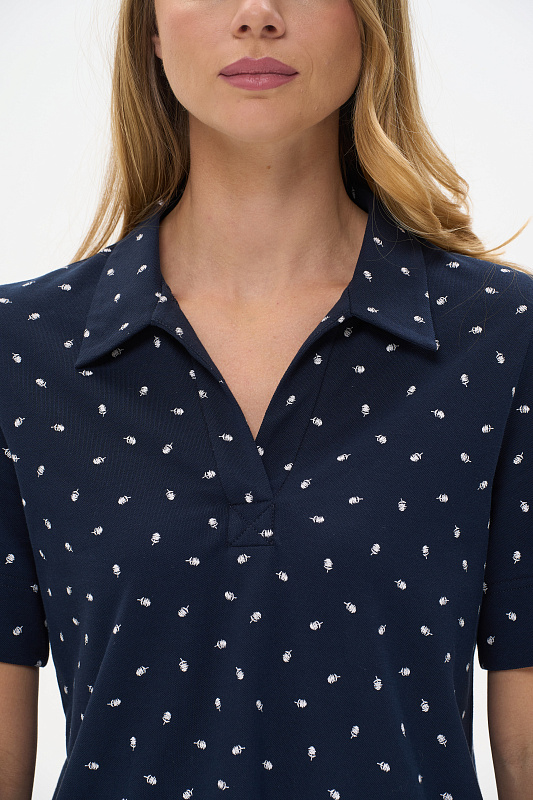 Джемпер из пике190 гр в Глубоком синем оттенке с белым графическим рисунком. Модель прямого силуэта, свободная, V-образный вырез горловины оформлен планкой, отложной воротник, короткие втачные рукава, в боковых швах разрезы. Лёгкий, комфортный джемпер для офиса и отдыха. Рост модели 175 см.