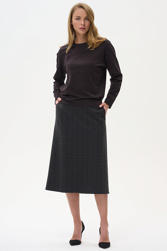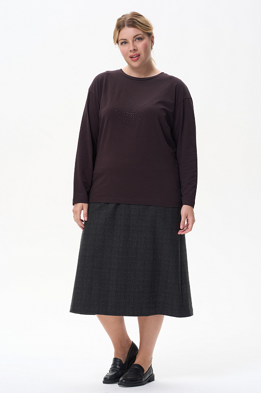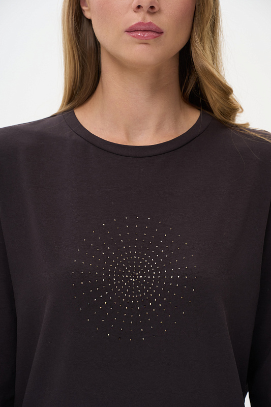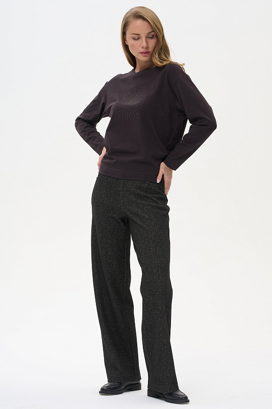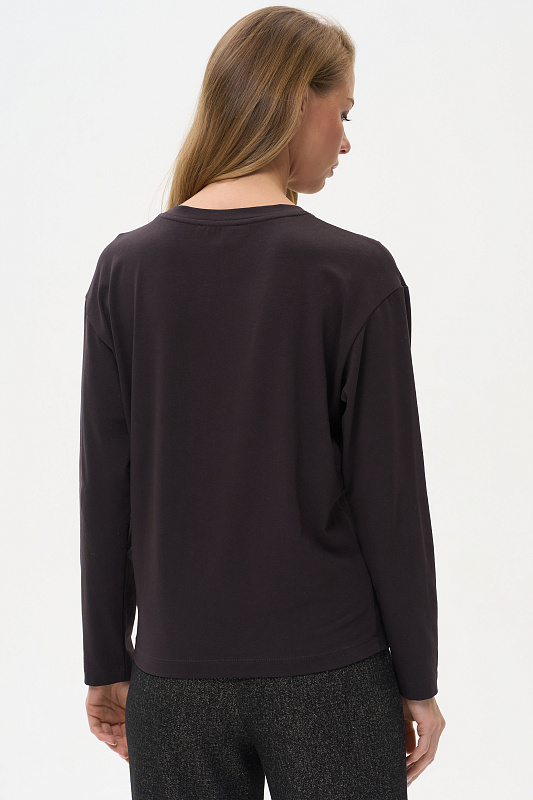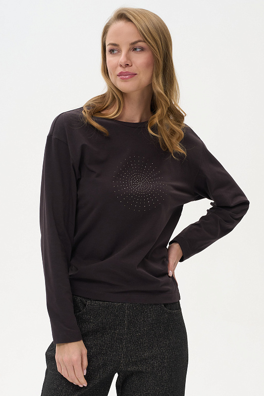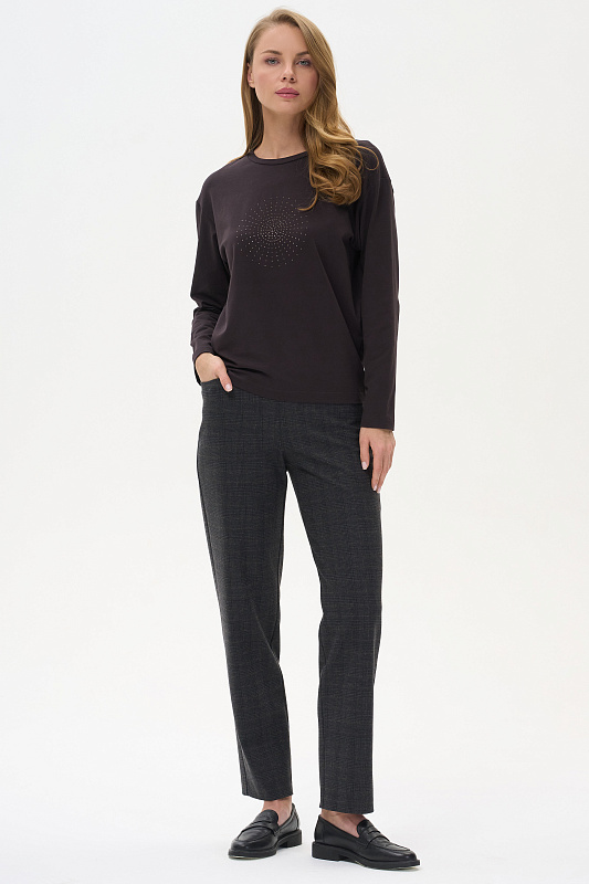 Лонгслив с принтом прямого силуэта, выполнен из хлопкового трикотажного полотна с эластаном. Круглый вырез горловины, длинные втачные рукава. Рост модели на фото 175.