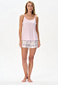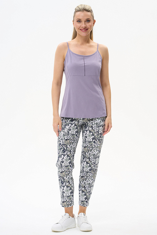 Майка из хлопкового полотна. Круглый вырез горловины. Спереди подрез и средний шов декорирован мережкой. Рост модели на фото 177.