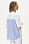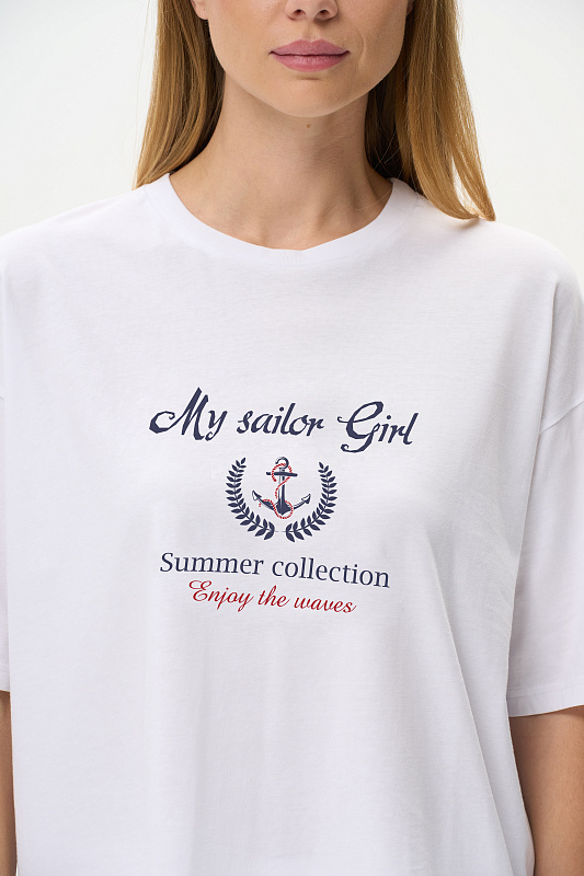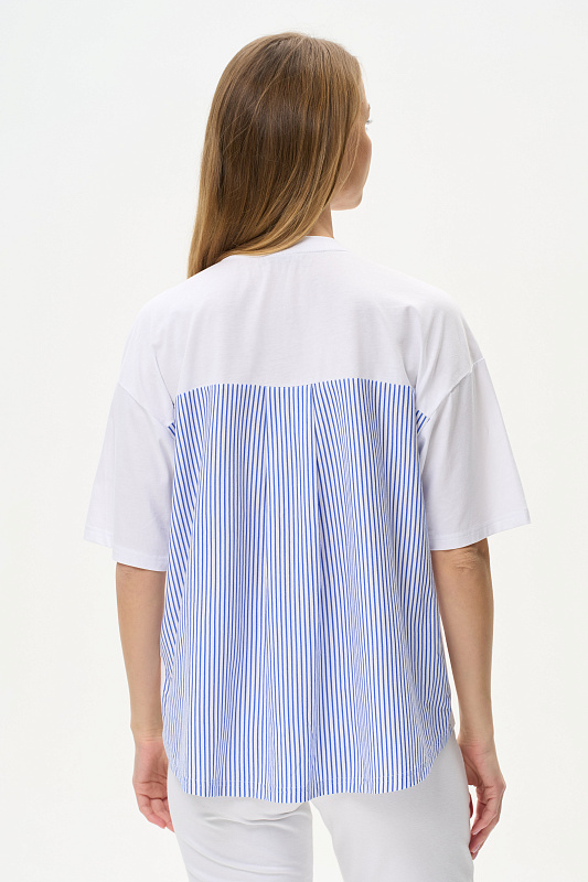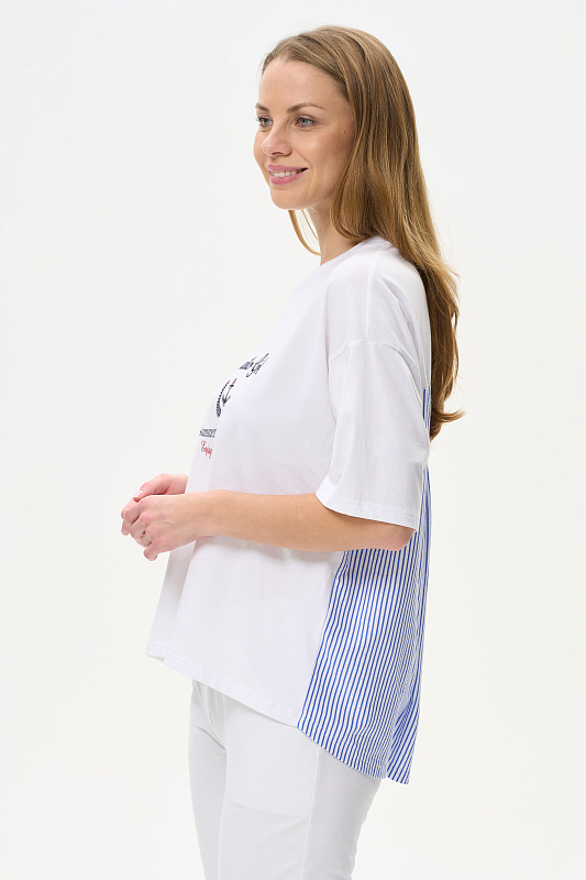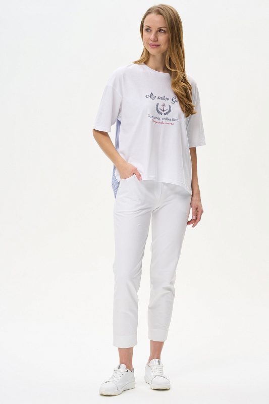 Интересно скомбинированная футболка. Полочка из кулирки качества ПЕ 150 гр в чистом белом оттенке, спинка из кулирки в сине-белую полоску. Модель свободная, расширенная к низу, круглый вырез горловины оформлен рибаной, спущенная линия проймы, рукава до локтя. Фигурная линия низа, на спинке складка, эффектная печать в морском стиле создаёт яркий акцент, Рост модели 175 см