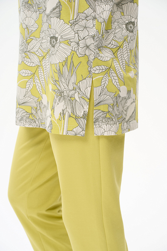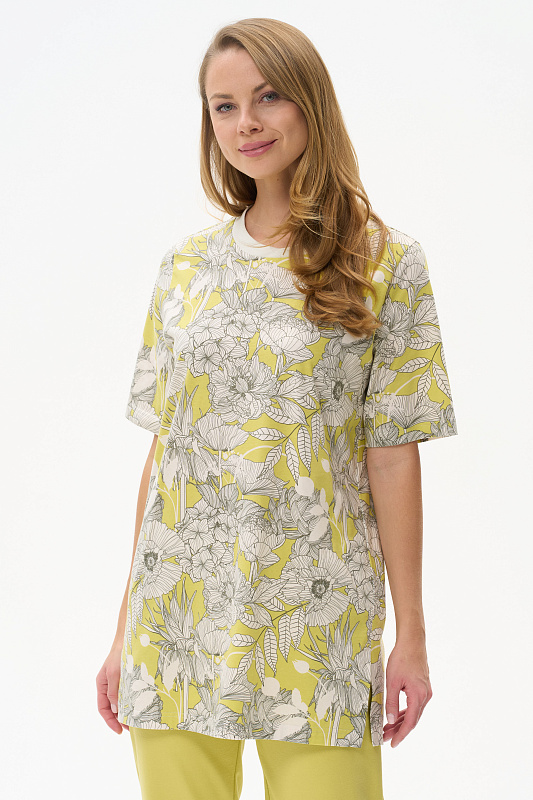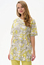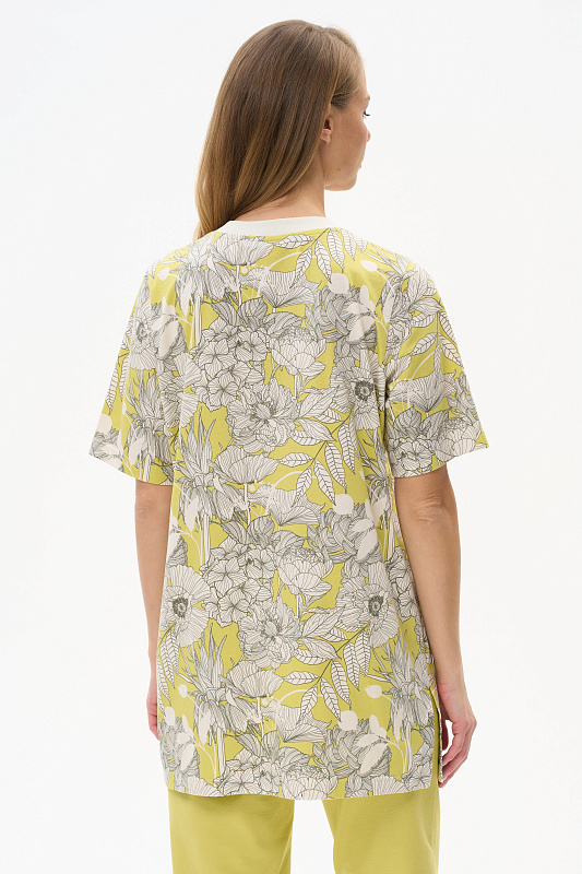 Футболка из кулирки качества ПЕ150 гр. Изящный растительный рисунок в трендовых оттенках. Модель свободная, удлинённая, круглый вырез горловины обработан рибаной, рукава широкие, длиной до локтя, по бокам разрезы. Очень комфортная, универсальная модель для дома и отдыха. Рост модели 175 см.