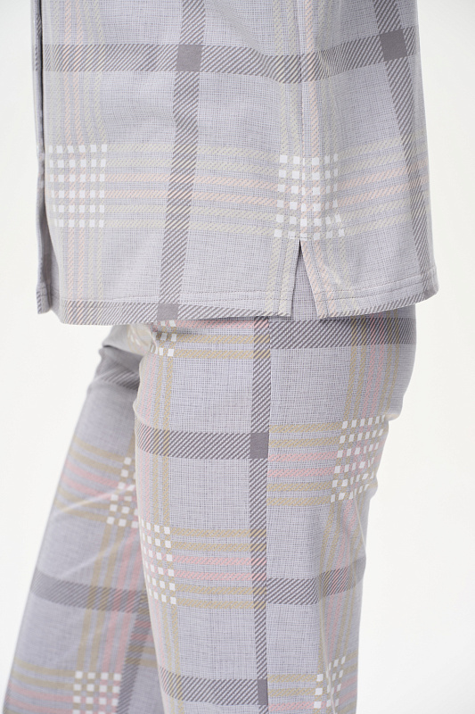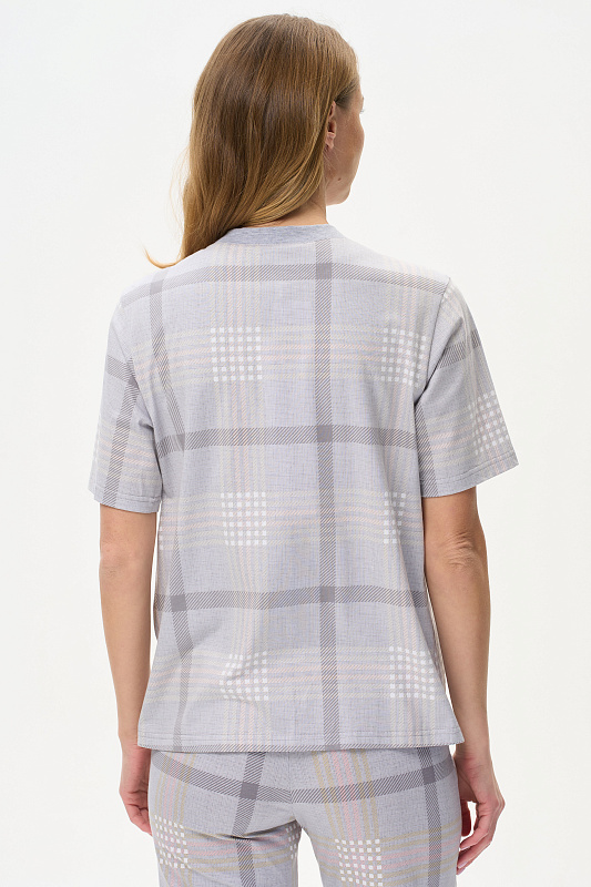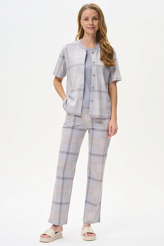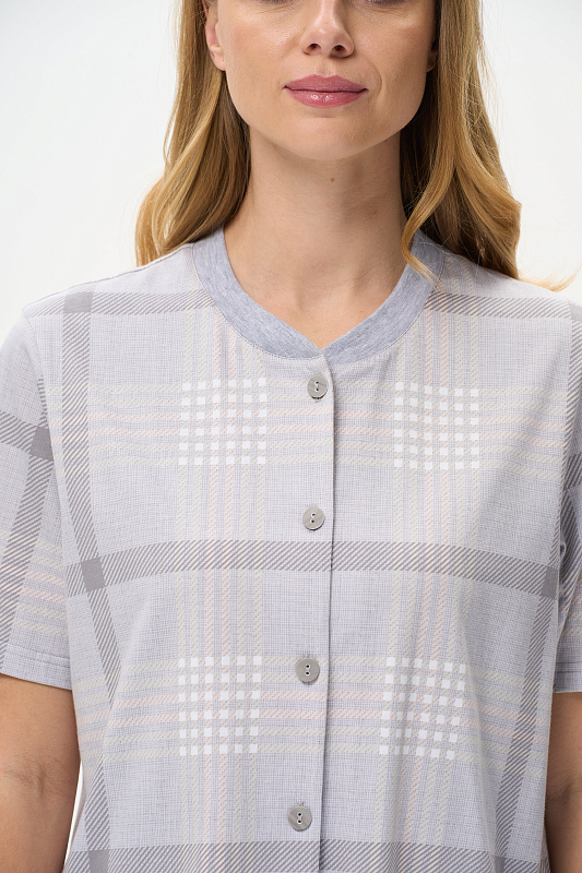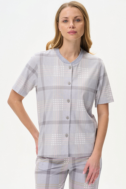 Блузка прямого силуэта из хлопкового трикотажного полотна. Воротник стойка выполнен из хлопкового полотна - рибана, застежка на пуговицы, по низу разрезы в боковых швах. Короткие втачные рукава. Рост модели на фото 175см.