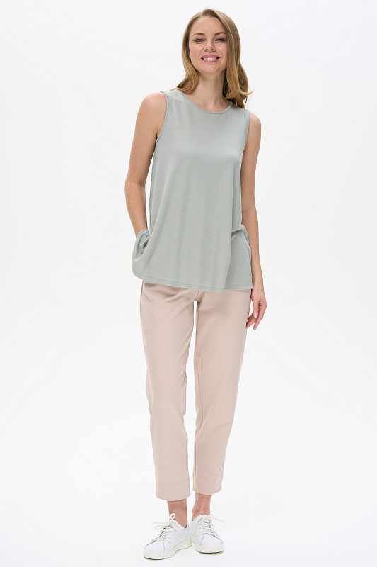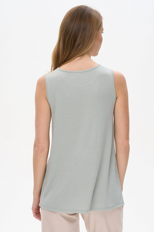 Топ из вискозного жаккардового трикотажного полотна. Круглый вырез горловины, без рукавов. Рост модели 175 см.