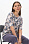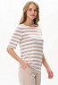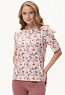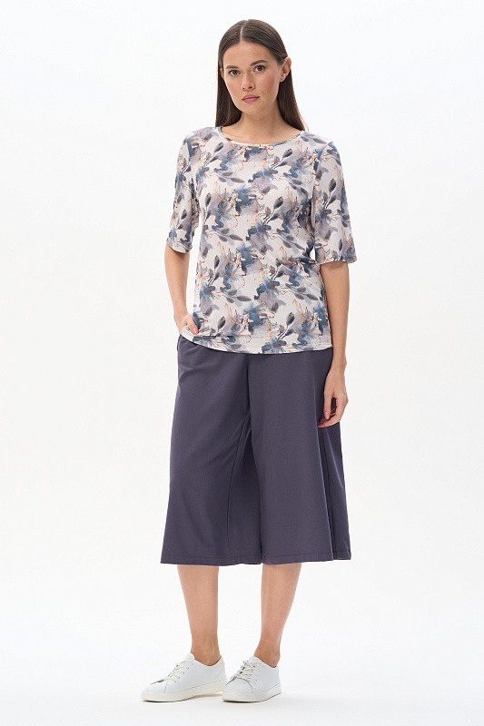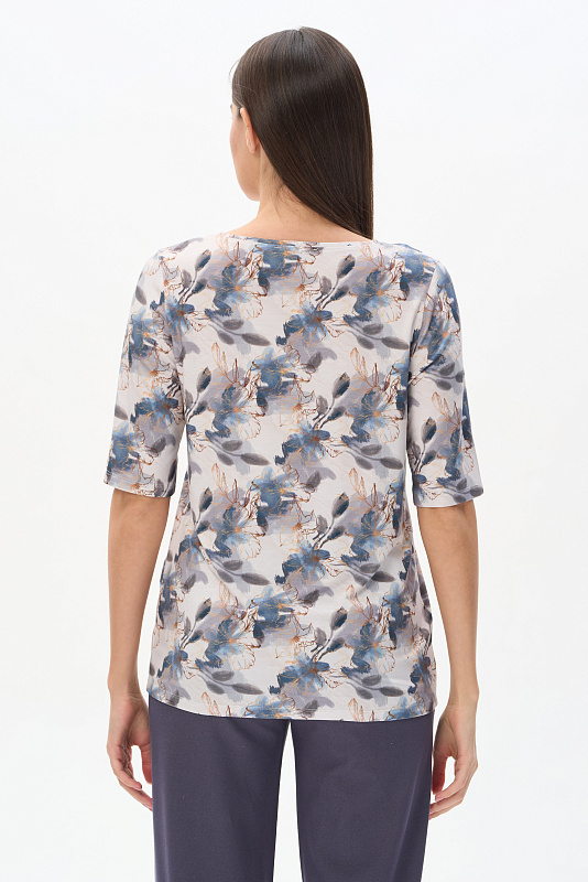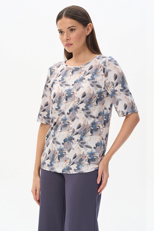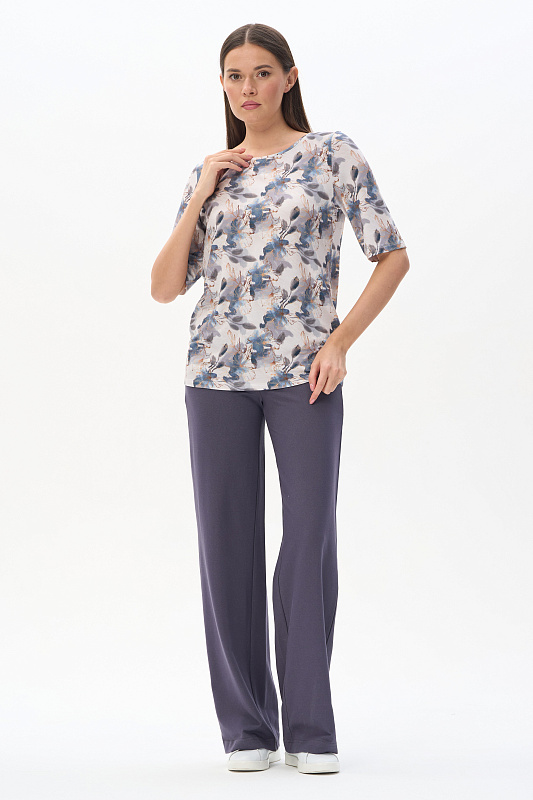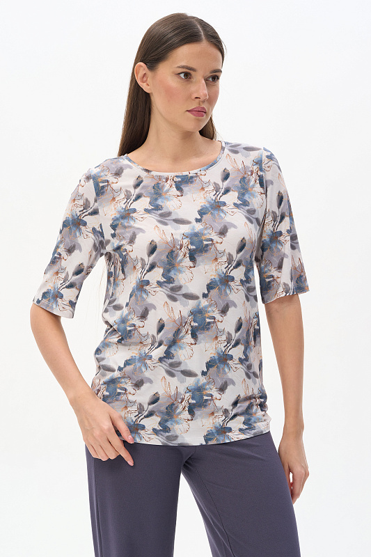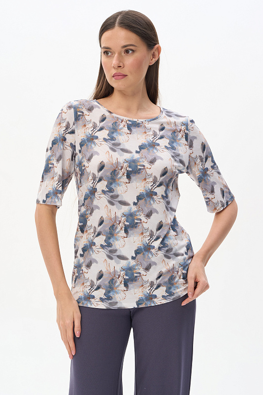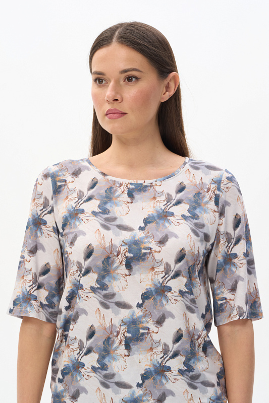 Блузка из вискозного трикотажного полотна с эластаном. Круглая форма горловины, втачные рукава, длинной до локтя. Рост модели 175 см.