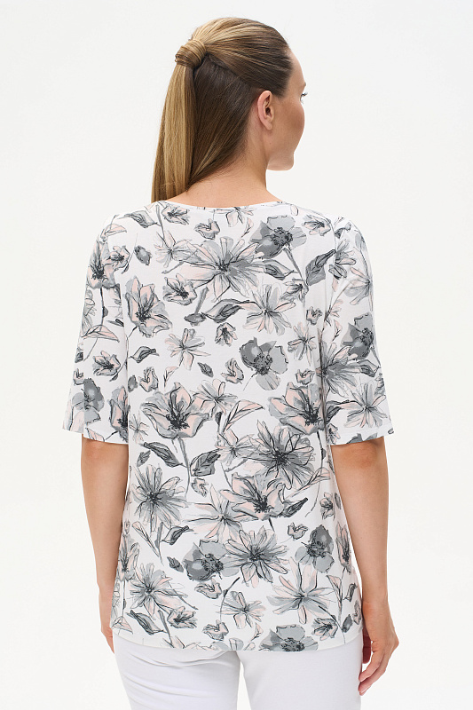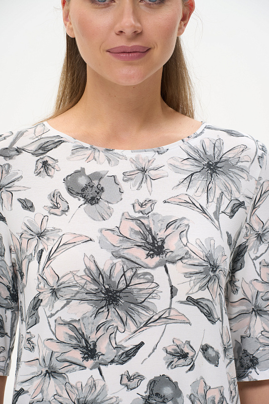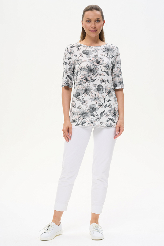 Блузка из вискозного трикотажного полотна с эластаном. Круглая форма горловины, втачные рукава, длинной до локтя. Рост модели 175 см.