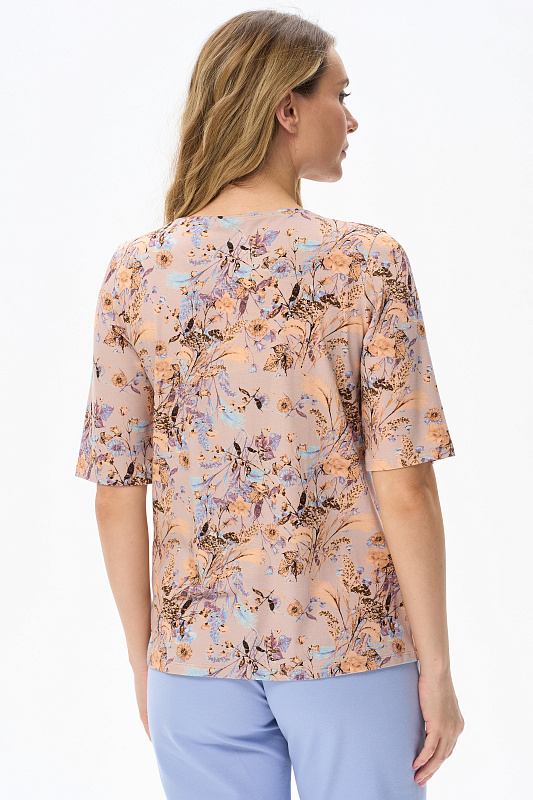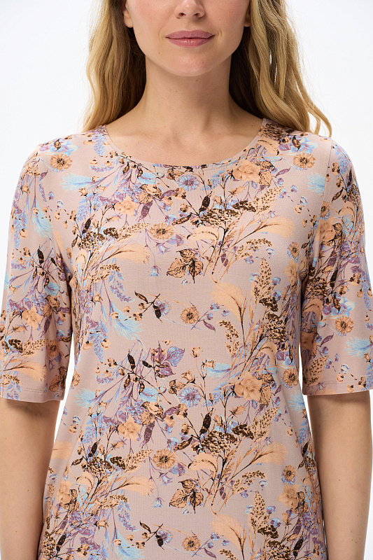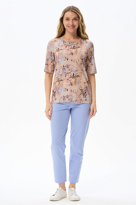 Блузка из вискозного трикотажного полотна с эластаном. Круглая форма горловины, втачные рукава, длинной до локтя. Рост модели 175 см.