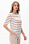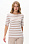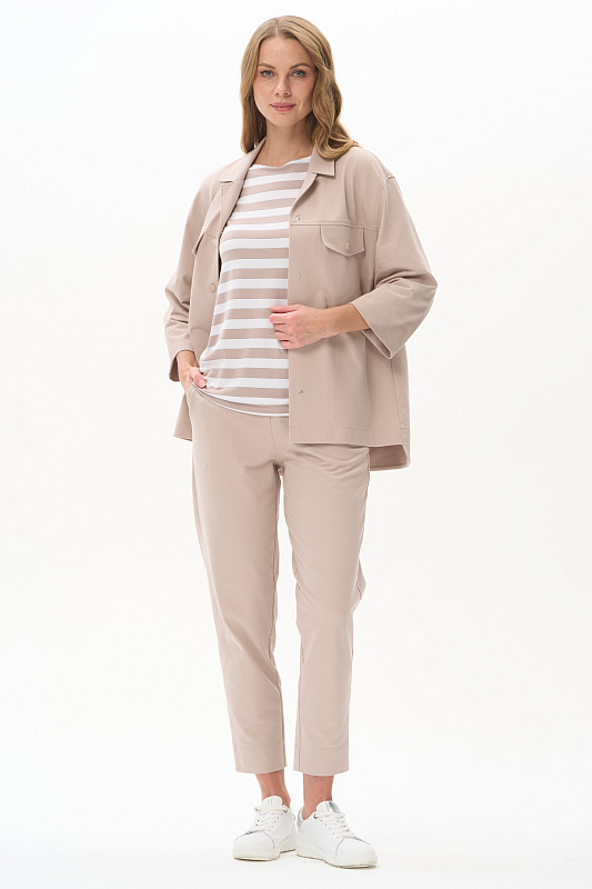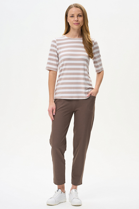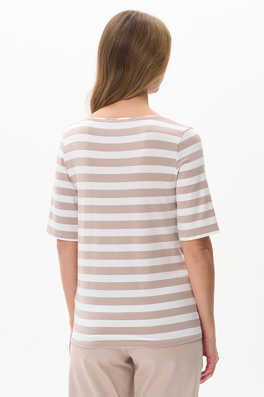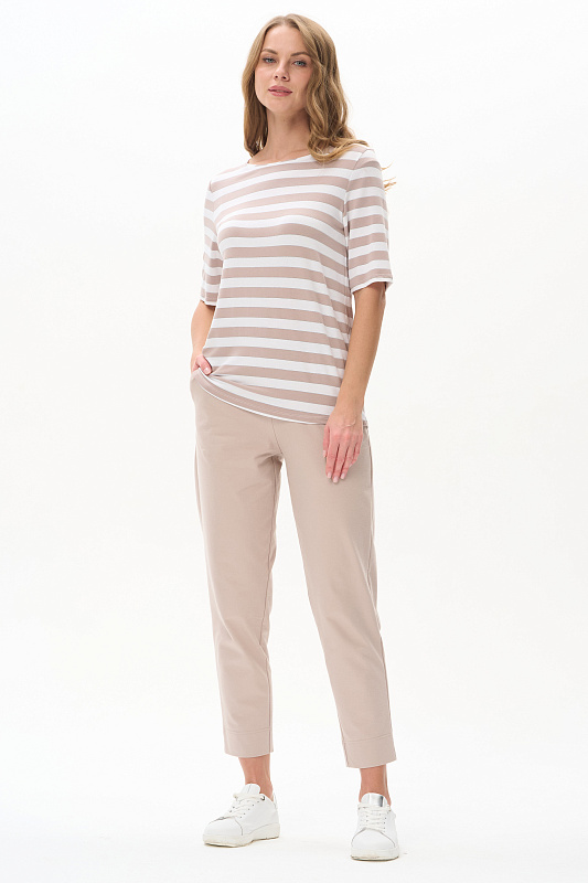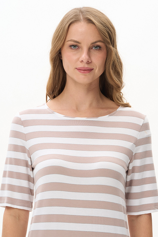Футболка из вискозы качества вортекс 200 гр, полоска в оттенках Капучино и Белый песок. Круглая горловина с тонким кантом, втачные рукава до локтя, длина блузки закрывает паховую зону. Тонкая серебристая полоска добавляет изысканности и переводит базовую модель в разряд нарядных изделий. Рост модели 175 см.
