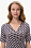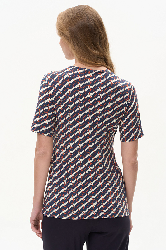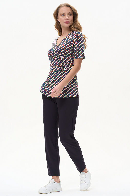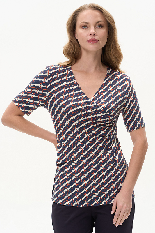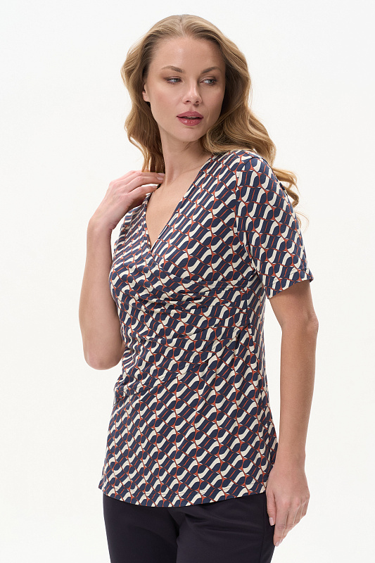Блузка из вискозы с графическим рисунком в стиле Gucci асимметричного кроя с имитацией запаха, высокие разрезы в боковых швах, рукава до локтя. Драпировка на полочке скрывает недостатки фигуры. Рост модели 175 см