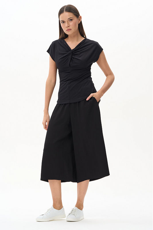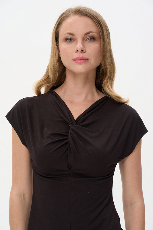 Стильная блузка из модала 190 гр в Глубоком чёрном оттенке. Модель с короткими спущенными рукавами и женственной драпировкой для привлекателных образов на каждый день и особых случаев. Блузка с трендовой драпировкой из мягкого, тактильно приятного модального полотна, невороятно привлекательна и комфортна. Рост модели 175 см.
