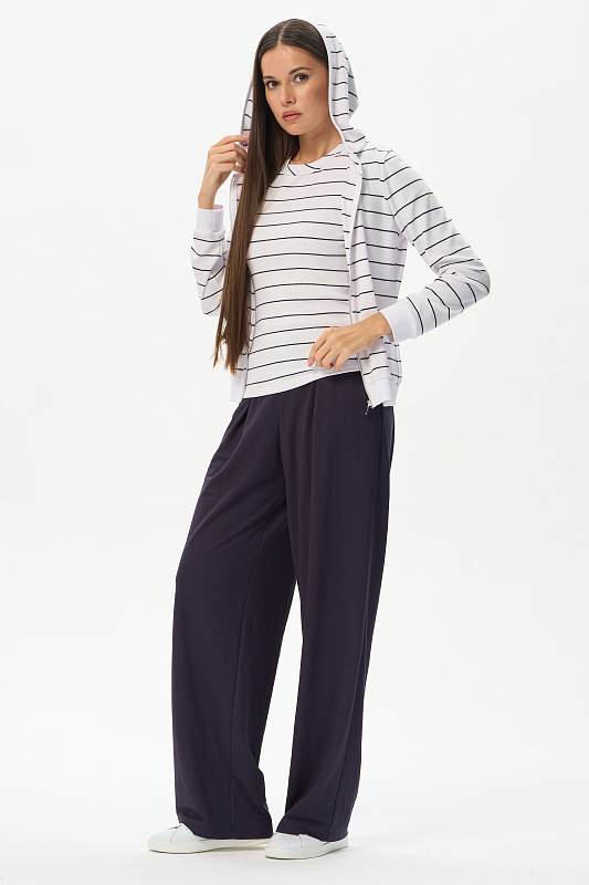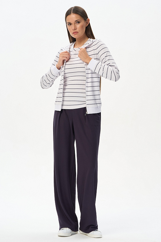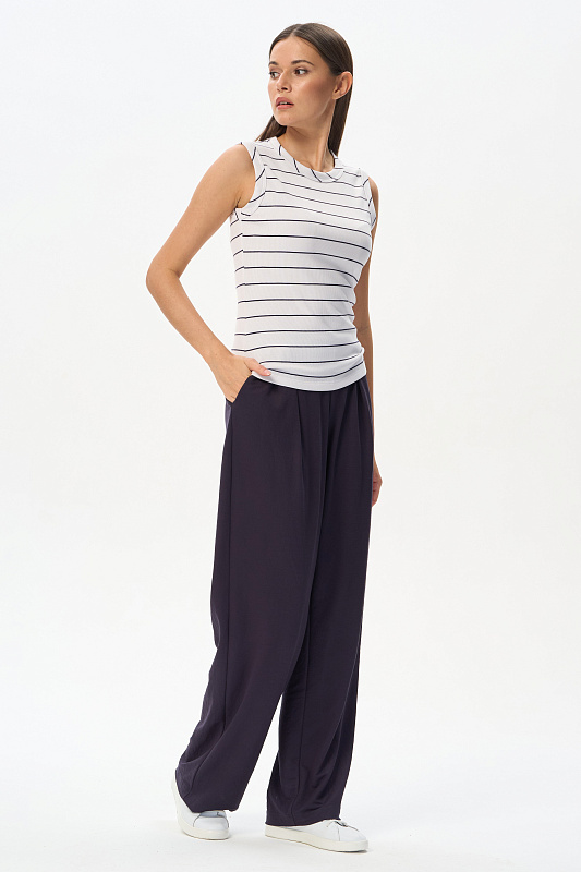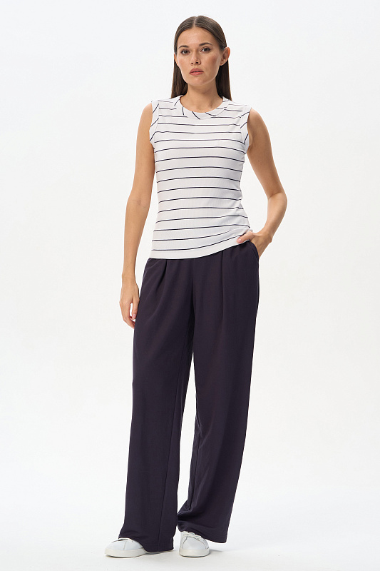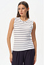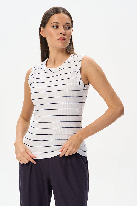 Майка в бело-синюю тонкую полоску с добавлением ПЭ для придания лёгкости полотну и формоустойчивости. Актуальная модель с широкой окантовкой по горловине и проймам. В комплекте с курткой из этого же полотна получаем эффектную модную "двойку". Прекрасная модель для города, офиса и путешествий. Рост модели 175 см.
