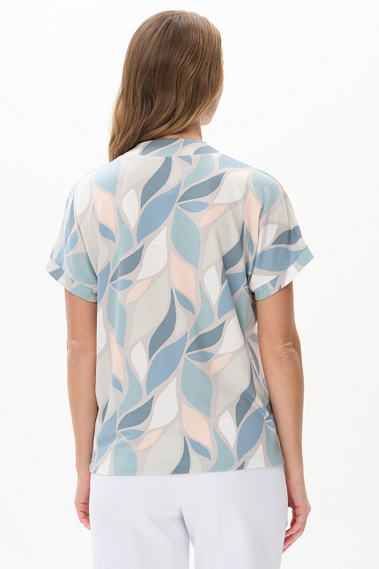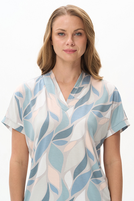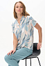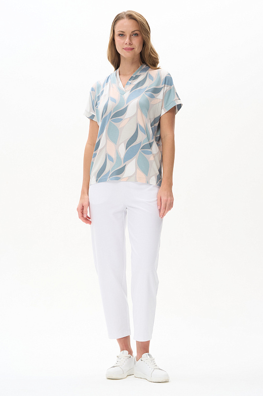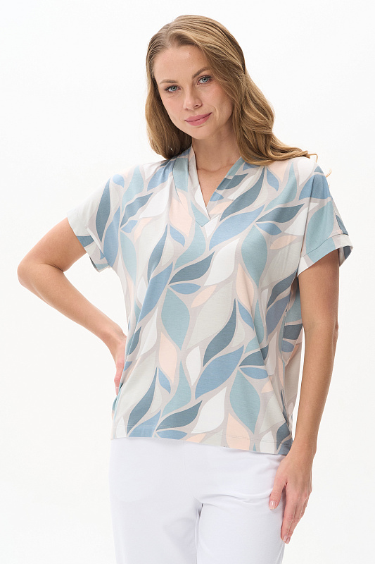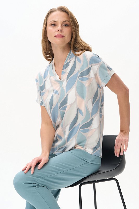Нарядная блузка из тонкой шелковистой вискозы качества вортекс c дизайнерским рисунком растительная абстракция Модель со складками на воротнике - а-ля «апаш» в стиле пятидесятых, что придает изделию необыкновенную женственность. Рукава короткие с заниженной проймой. Эта приятная модель - идельный союзник для всех низов коллекции Рост модели 175 см.