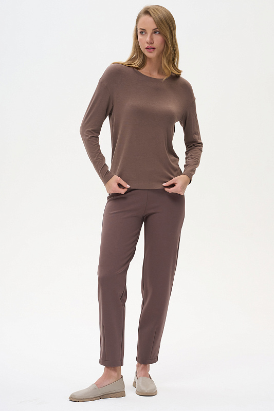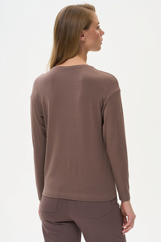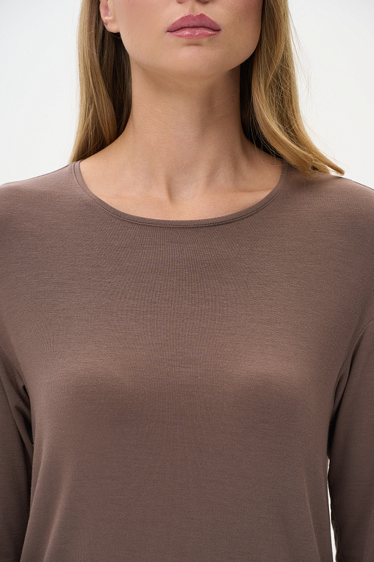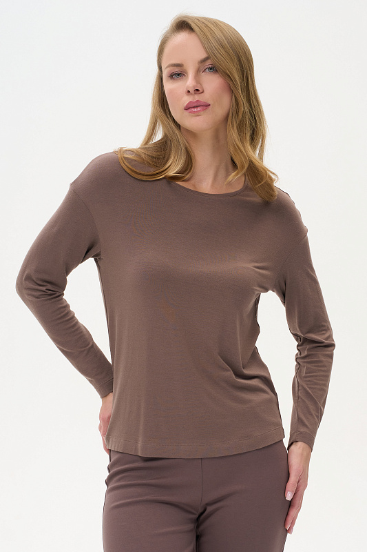 Комфортный лонгслив из вискозного трикотажного полотна - модал (экологически чистая ткань нового поколения). Прямого силуэта с длинными втачными рукавами и круглой формой горловины. Рост модели 178 см