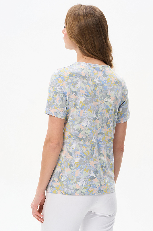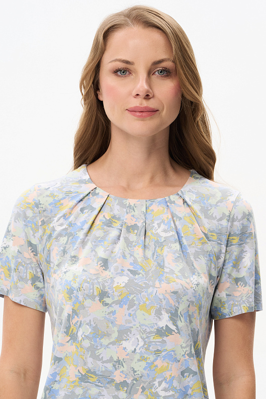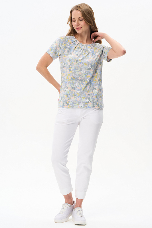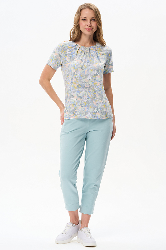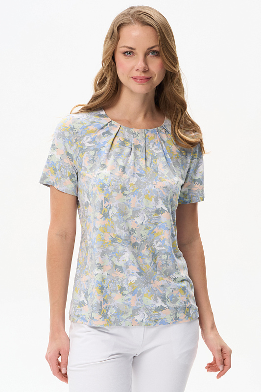 Блузка из вискозного полотна. Модель с округлой горловиной и мягкими складками. Втачные короткие рукава. Рост модели 175 см.