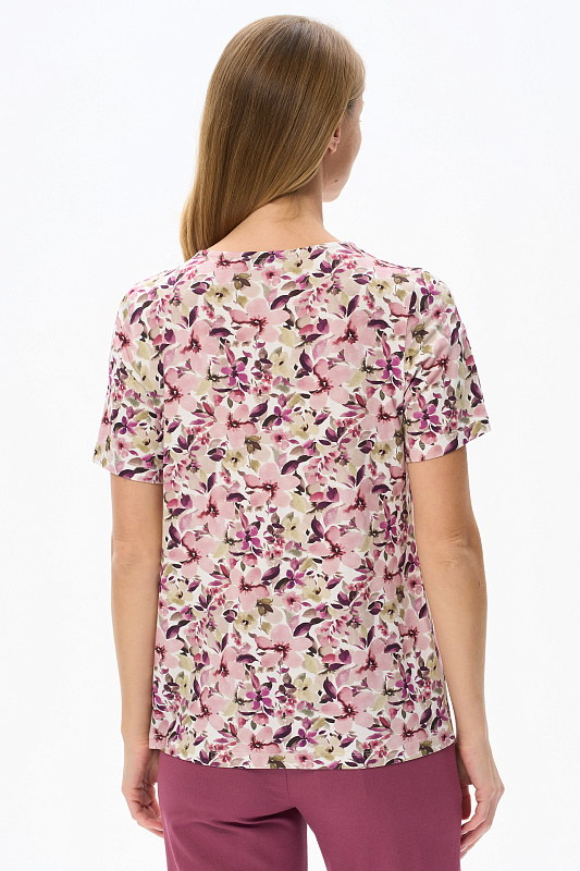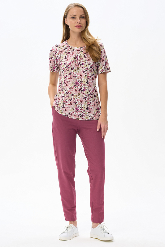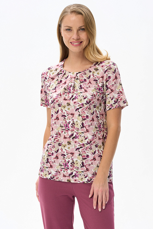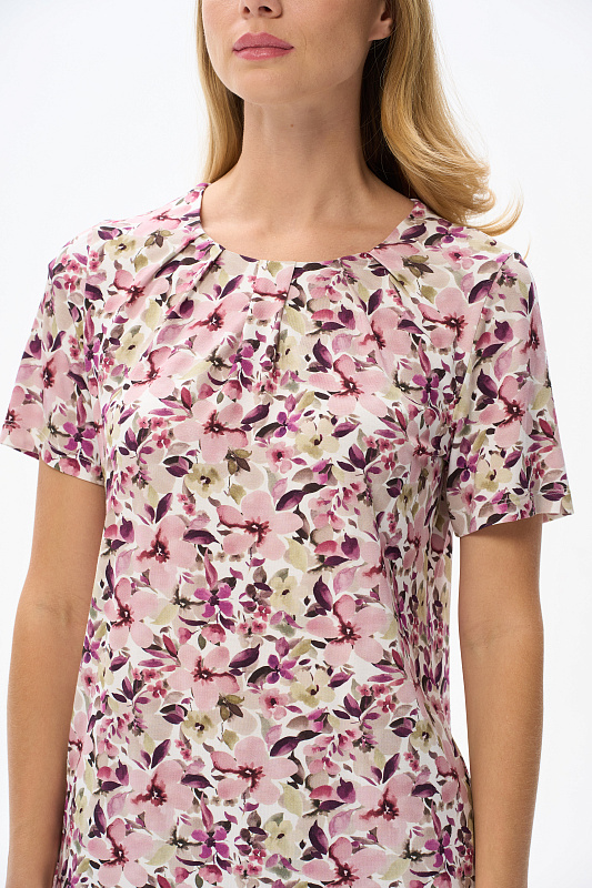 Блузка из вискозного полотна. Модель с округлой горловиной и мягкими складками. Втачные короткие рукава. Рост модели 175 см.