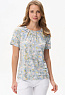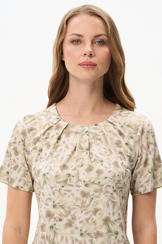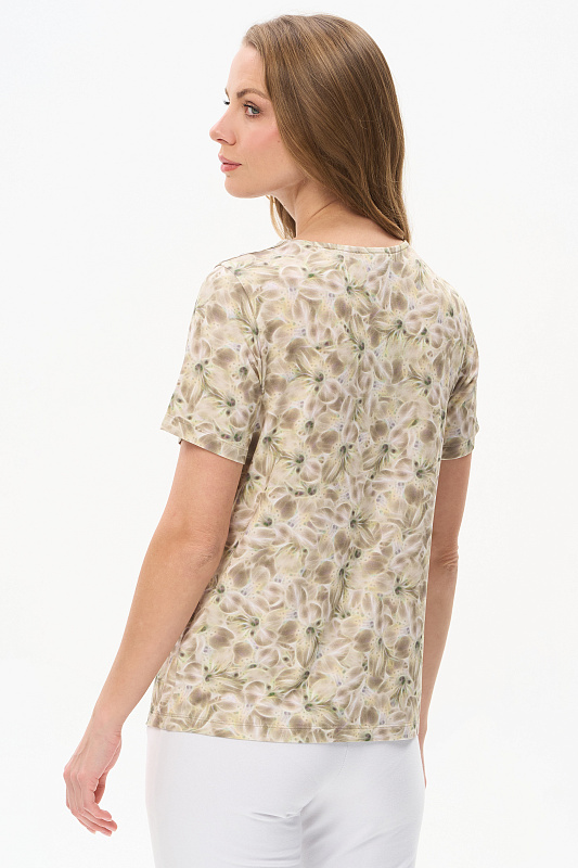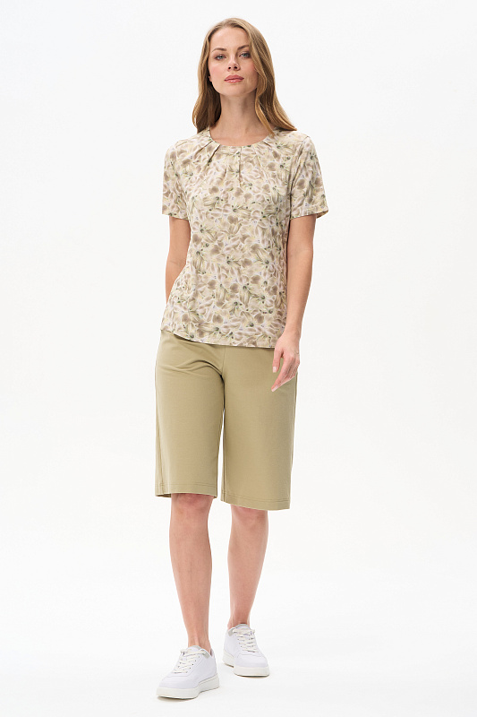 Блузка из вискозного полотна. Модель с округлой горловиной и мягкими складками. Втачные короткие рукава. Рост модели 175 см.