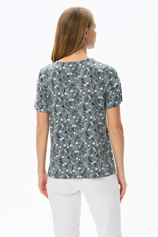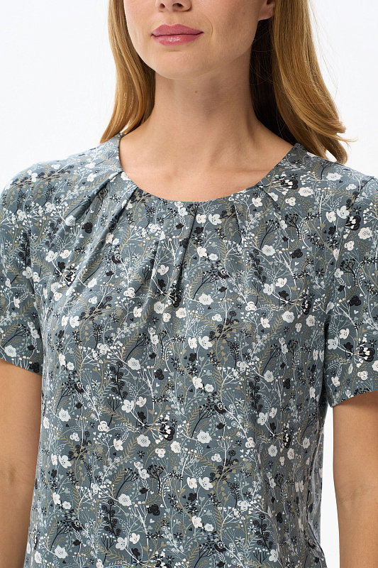 Блузка выполнена из вискозного полотна. Модель с округлой горловиной и мягкими складками. Втачные короткие рукава. Рост модели 175 см.