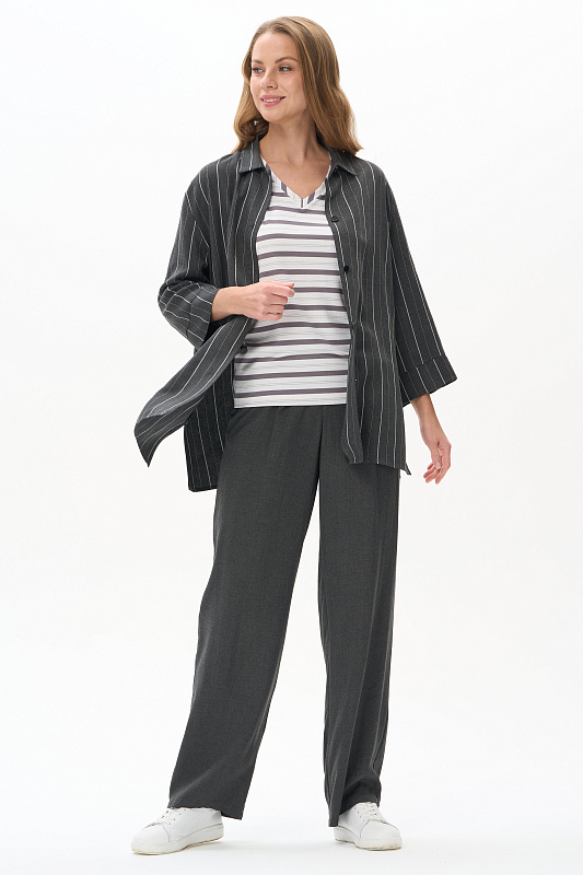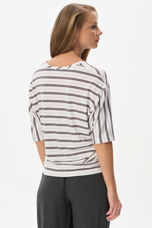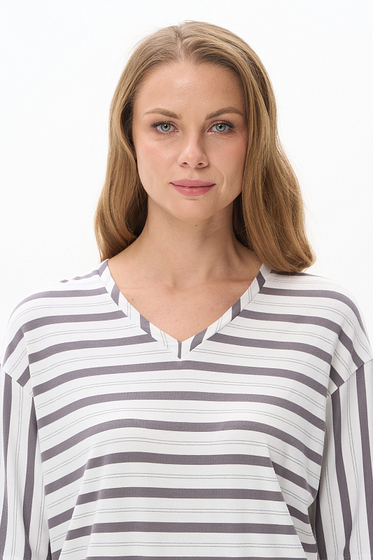 Эффектная блузка нового силуэта - свободная в плечевом поясе и прилегающая по бедрам, из вискозного полотна в полоску. Модель с V-вырезом горловины, спущеная линия плеча, длина рукавов за локоть. Игра полосок добавляет энергии этой модели. Рост модели 175 см