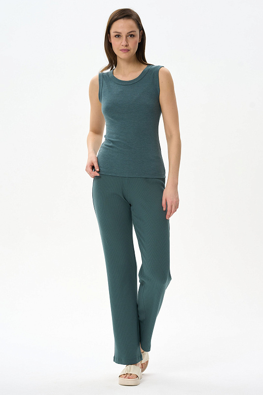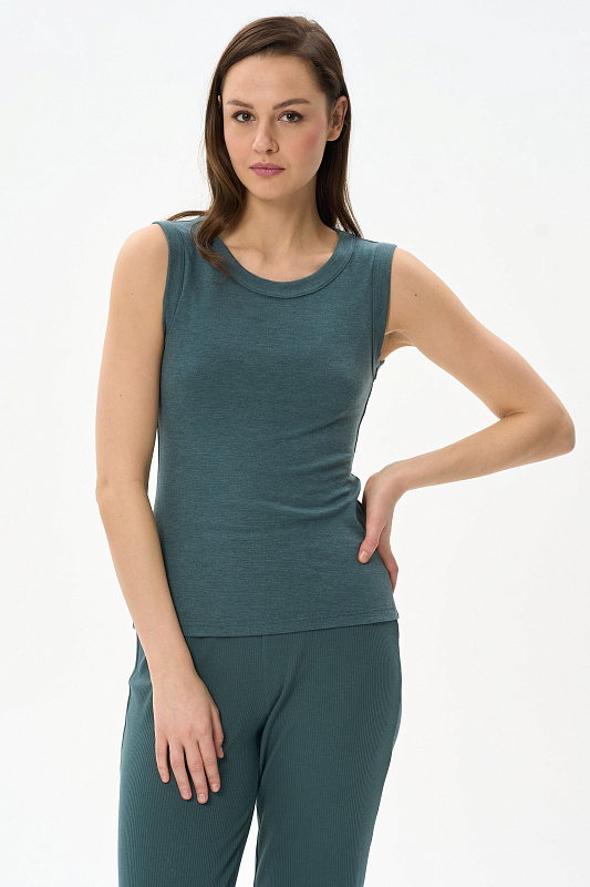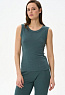 Топ выполнен из вискозного трикотажного полотна - рибана. Модного прилегающего силуэта. Круглый вырез горловины и завышенные проймы обработаны широкой планкой. Рост модели на фото 178см.