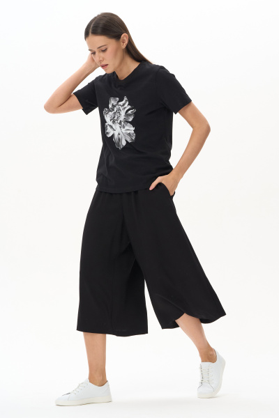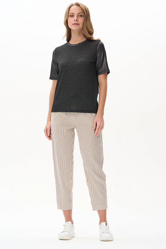 Свободная блузка комбинированная: полочка и спинка из тонкого трикотажа с серебристым блеском 110 гр. Рукава до локтя и планка по горловине из кашкорсе с серебристым покрытием. Комфортная блузка с трендовым металлизированным эффектом. Рост модели 175 см.