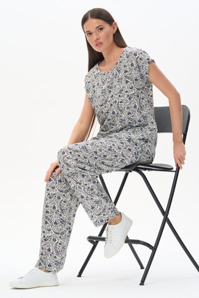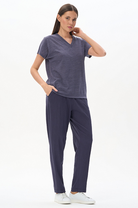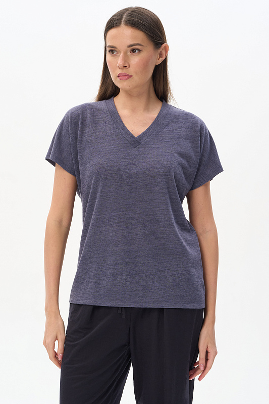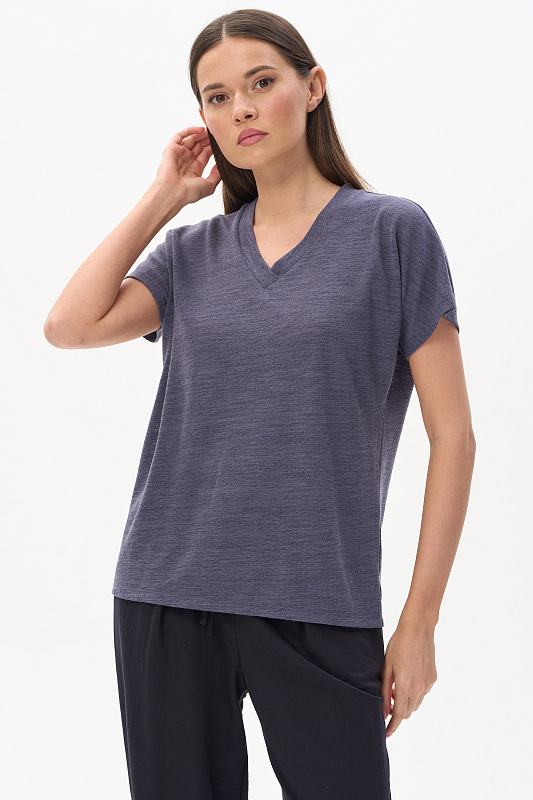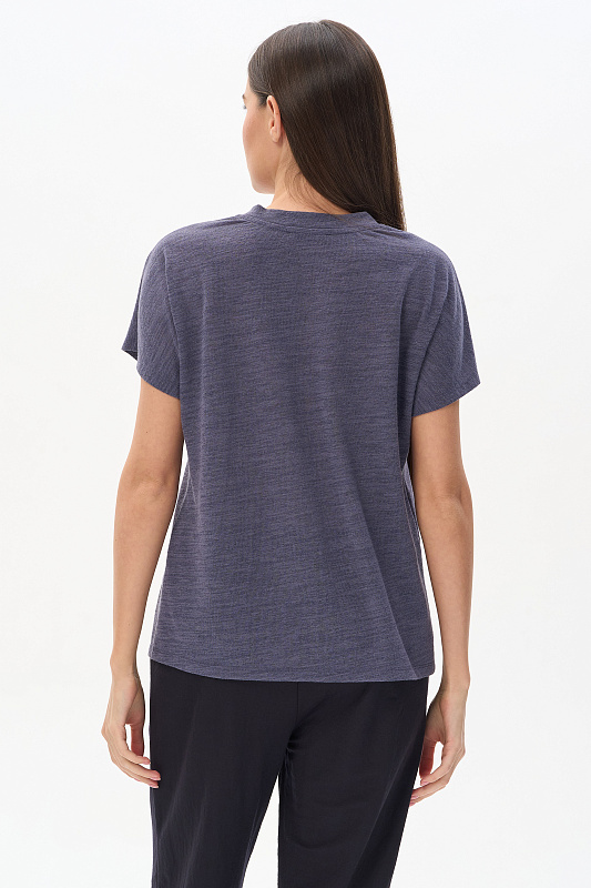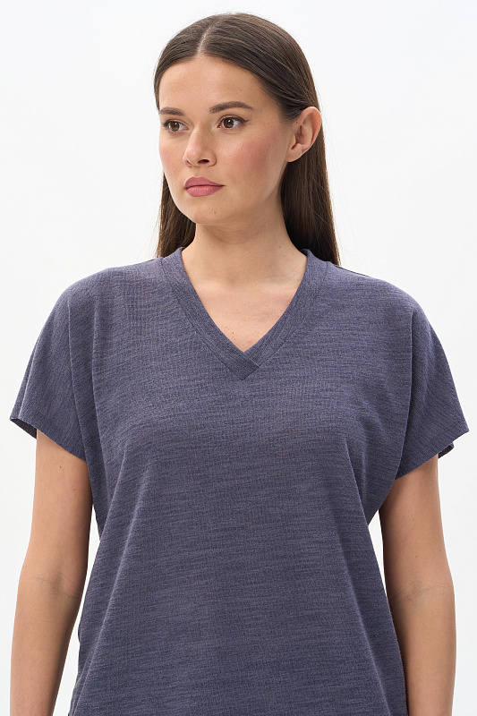 Свободная футболка из вискозного жаккарда в оттенке Тёмный сапфир. Красивый V-образный вырез горловины оформлен планкой, короткие цельнокроеные рукава. Лёгкая, приятная, эффектная модель для лета, благодаря фактуре и трендовой полупрозрачности образ будет выглядеть актуально. Незаменима в жаркие дни и подходит к любым низам коллекции. Рост модели 175 см.