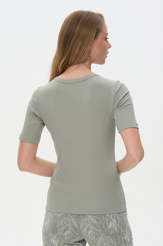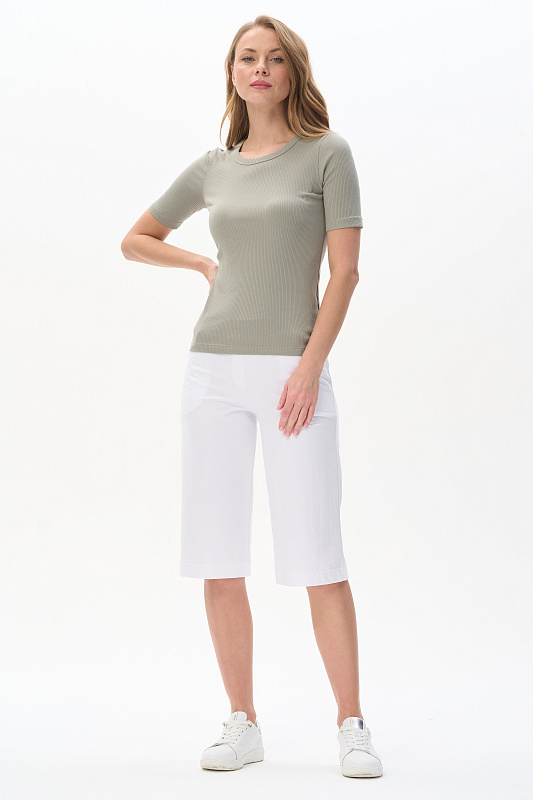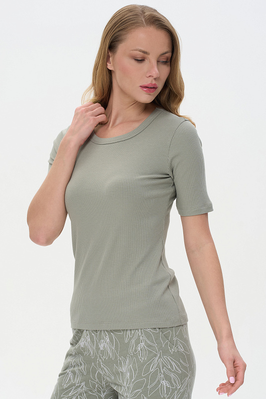 Футболка из фактурного хлопкового полотна с модалом 200 гр.в оттенке Полынь. Актуальная приталенная модель с широкой окантовкой по горловине, короткие втачные рукава. Идеально сочетается с жакетами, рубашками, брюками, шортами. Позволяет создавать трендовые образы. Рост модели 175 см