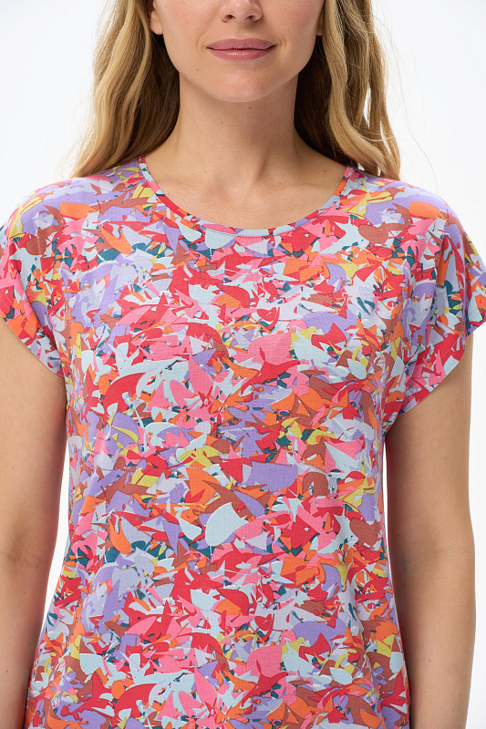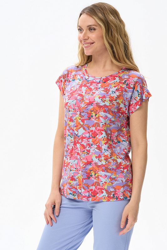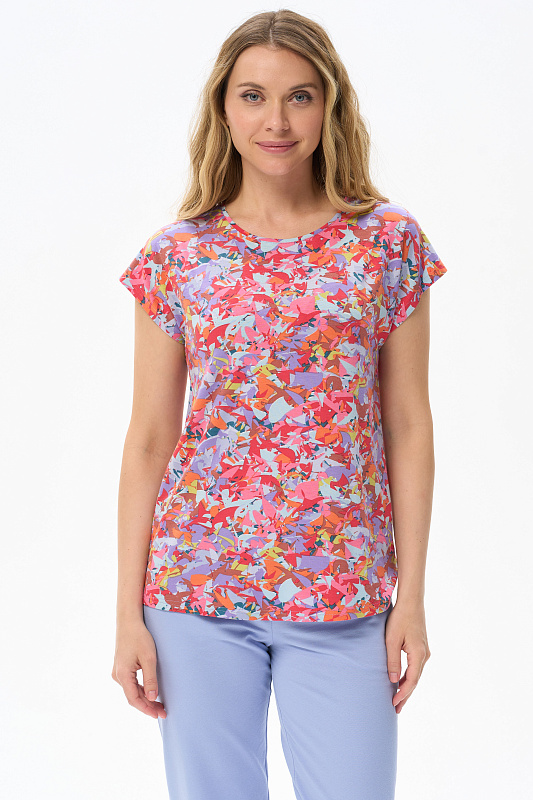 Футболка прямого силуэта из вискозного трикотажного полотна с эластаном. Круглый вырез горловины, цельнокроеные короткие рукава. Рост модели 175 см.