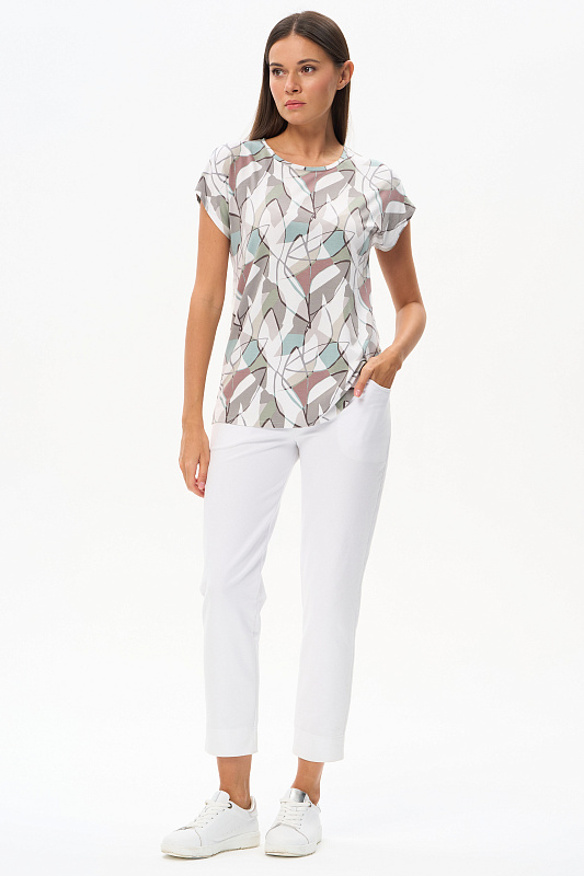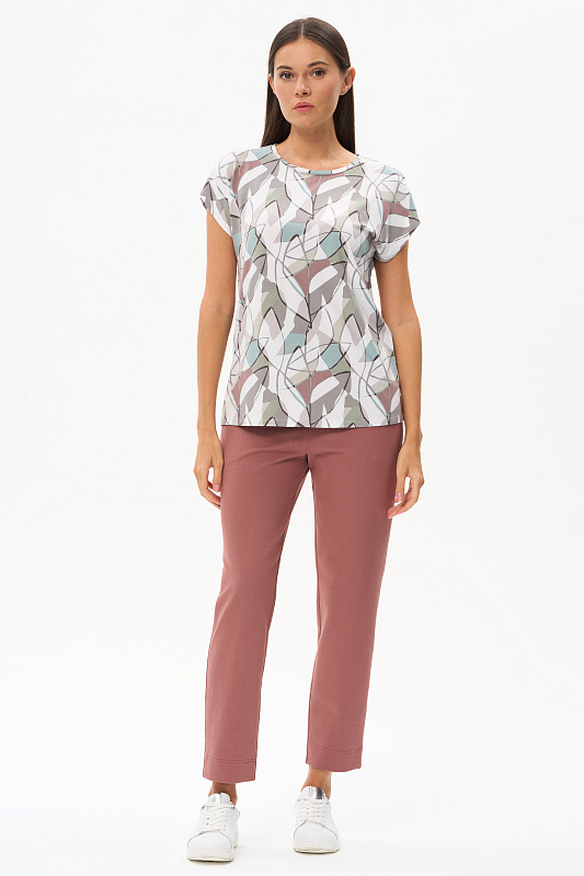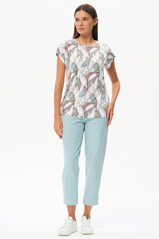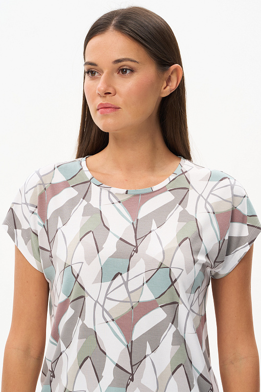 Футболка прямого силуэта из вискозного трикотажного полотна с эластаном. Круглый вырез горловины, цельнокроеные короткие рукава. Рост модели 175 см.
