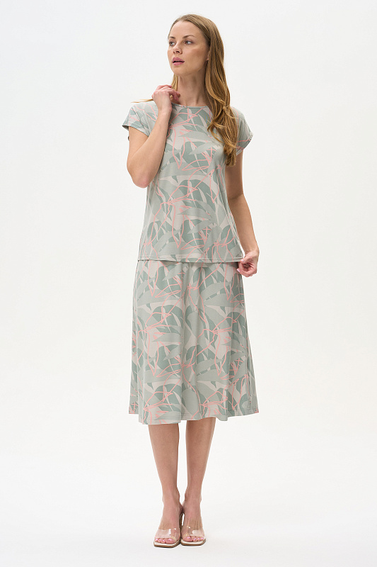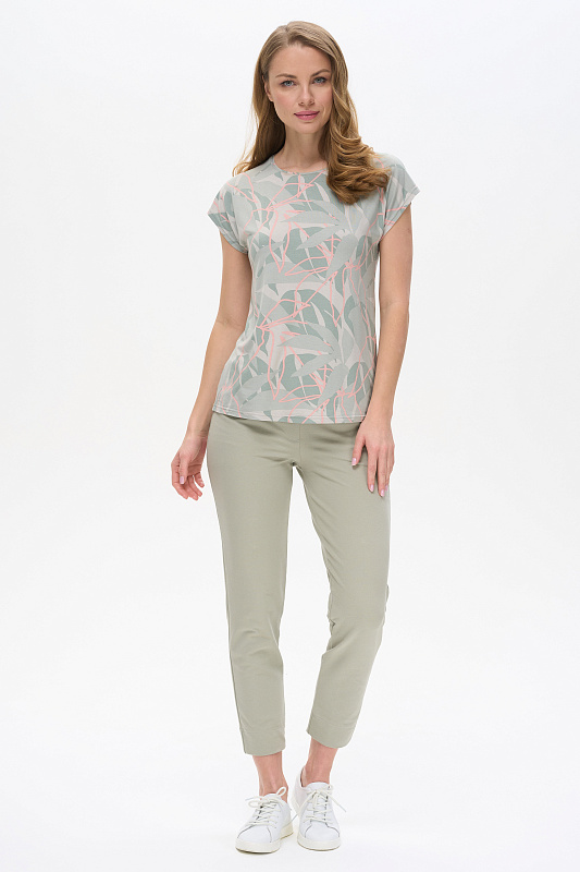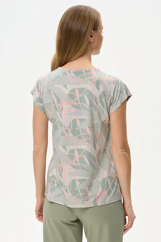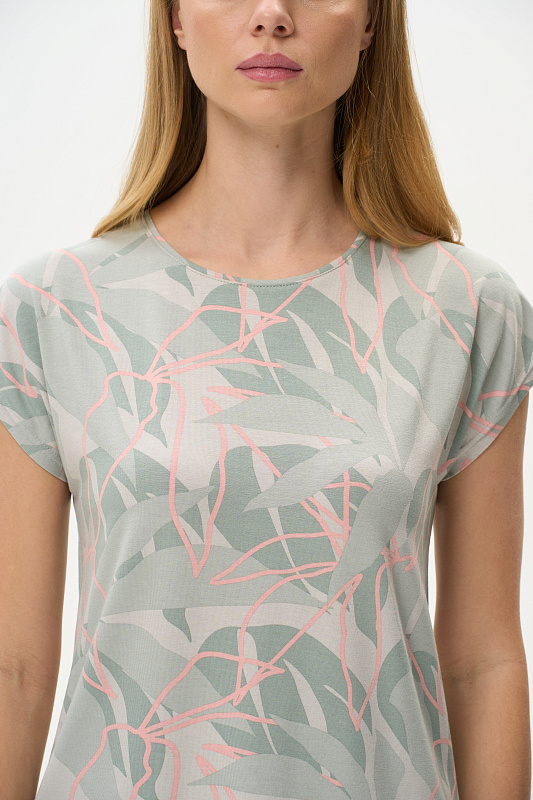 Футболка прямого силуэта из вискозного трикотажного полотна с эластаном. Круглый вырез горловины, цельнокроеные короткие рукава. Рост модели 175 см.