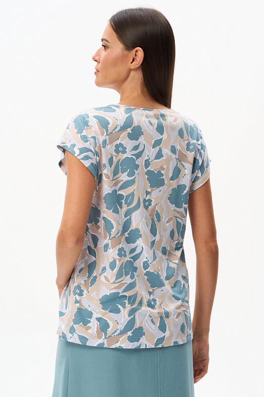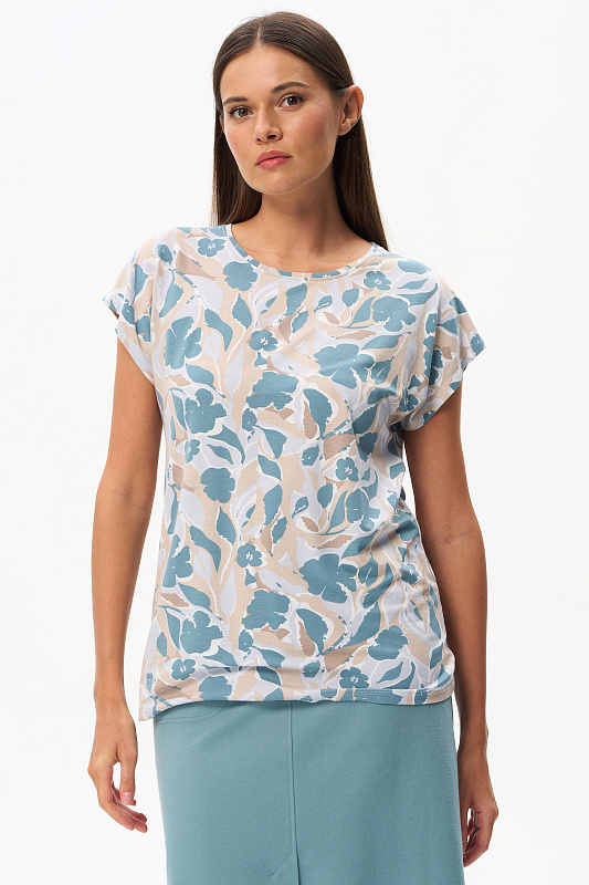 Блузка прямого силуэта из вискозного полотна c дизайнерским рисунком - Цветочная абстракция. Модель со спущенной линией плеча, цельнокроеные короткие рукава, круглый вырез горловины, длиной чуть ниже середины бедер. Универсальная, комфортная модель для лета. Рост модели 175 см