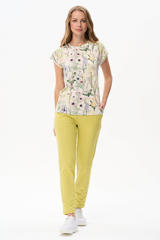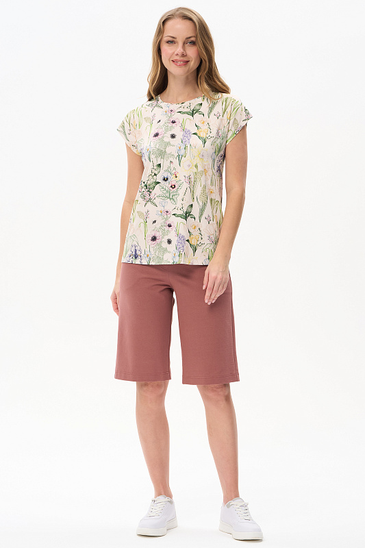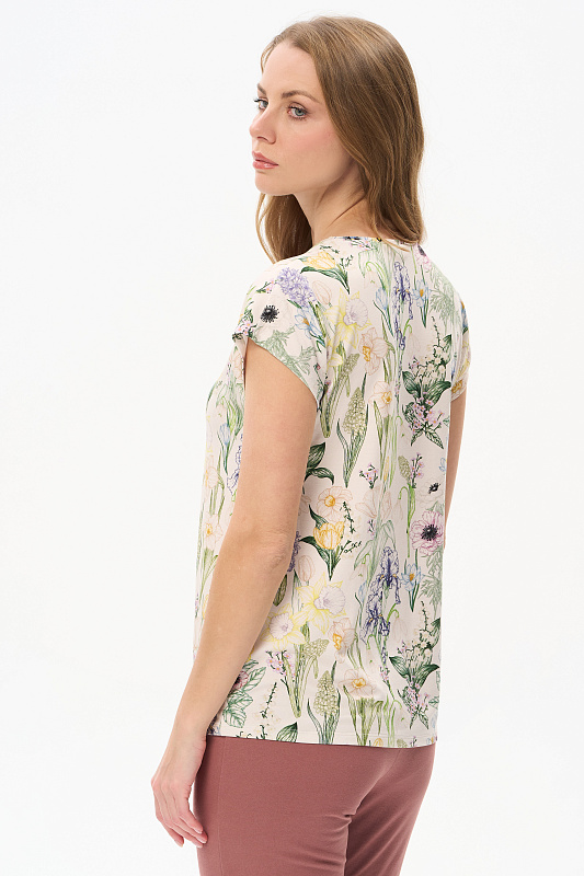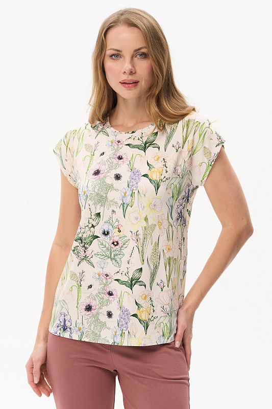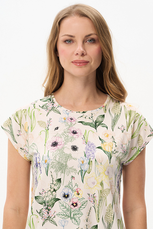 Футболка прямого силуэта из вискозного трикотажного полотна с эластаном. Круглый вырез горловины, цельнокроеные короткие рукава. Рост модели 175 см.
