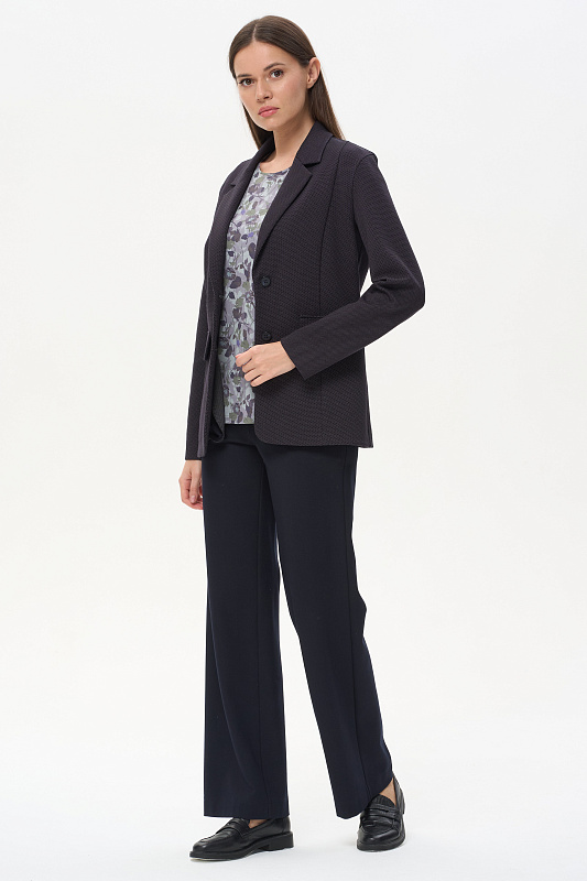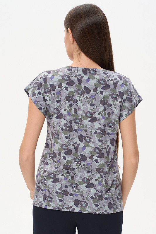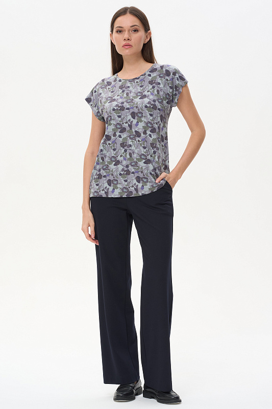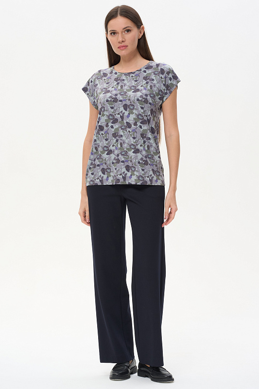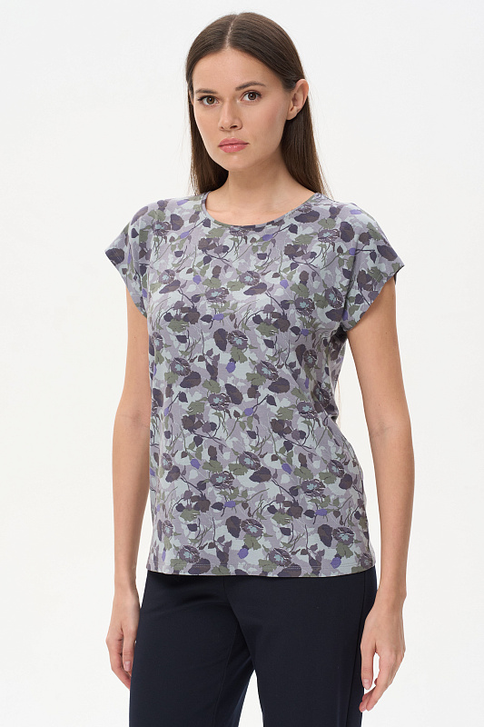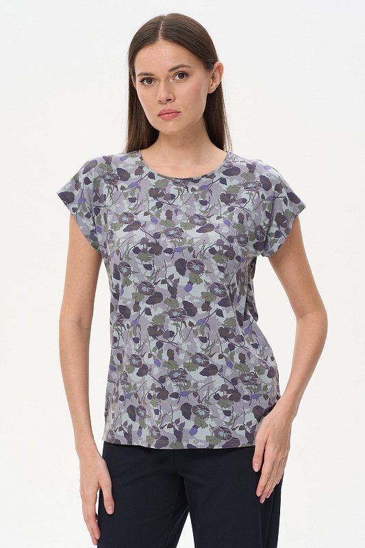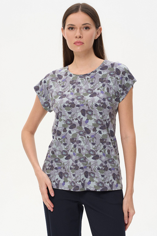 Футболка прямого силуэта из вискозного трикотажного полотна с эластаном. Круглый вырез горловины, цельнокроеные короткие рукава. Рост модели 175 см.