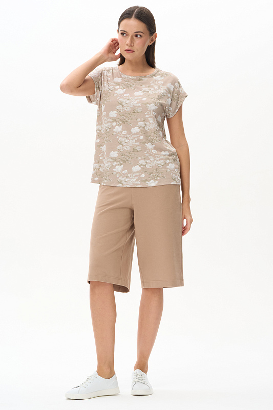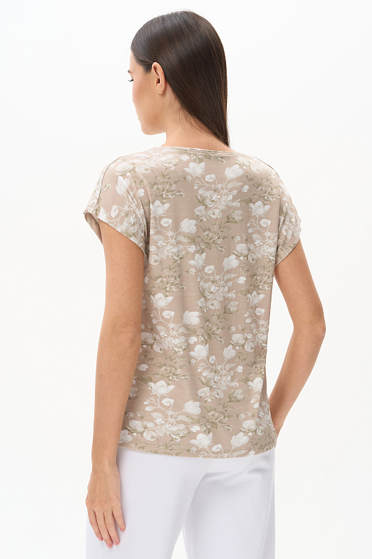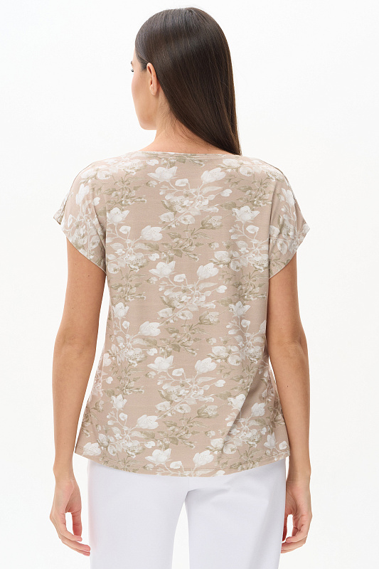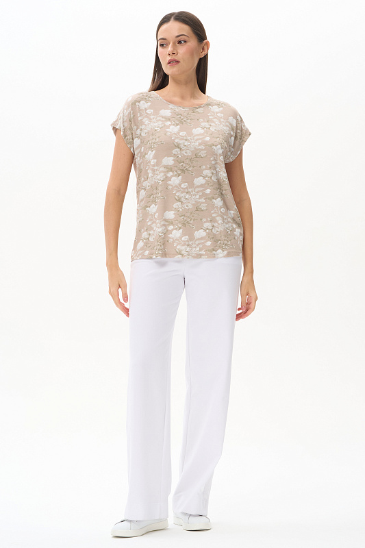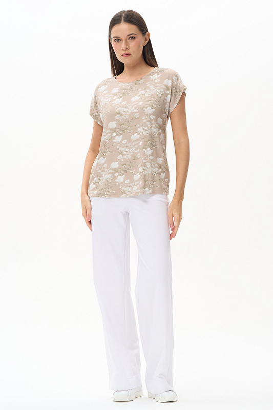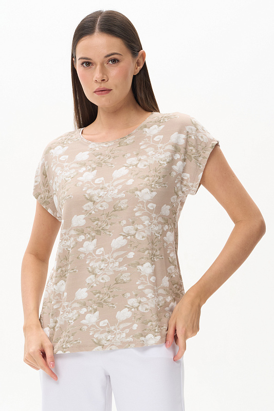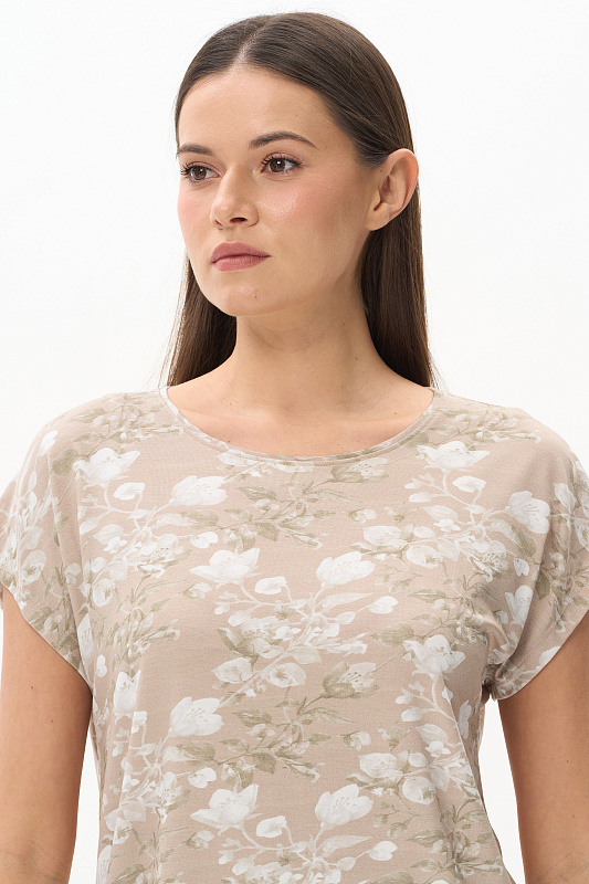Футболка прямого силуэта из вискозного полотна 200 гр c Цветочным рисунком. Модель со спущенной линией плеча, цельнокроеные короткие рукава, круглый вырез горловины, длиной чуть ниже середины бедер. Универсальная, комфортная модель для лета в приятной, спокойной расцветке. Рост модели 175 см.