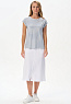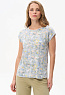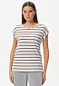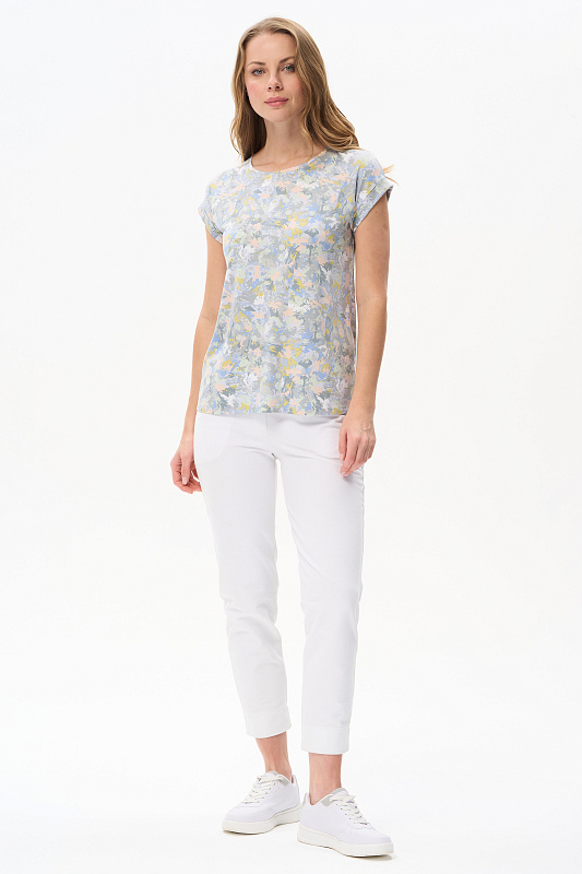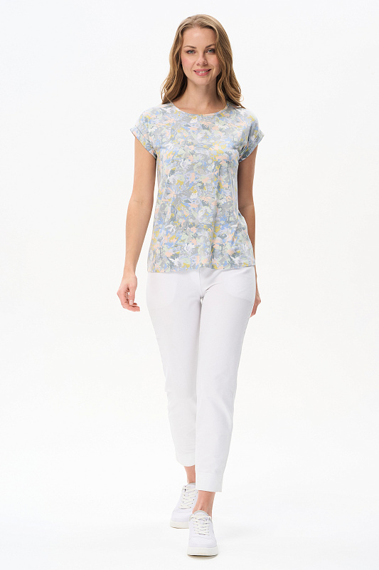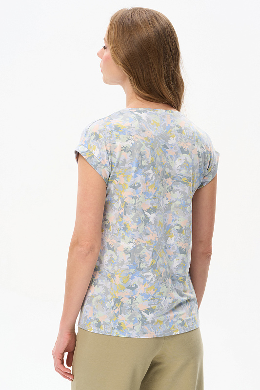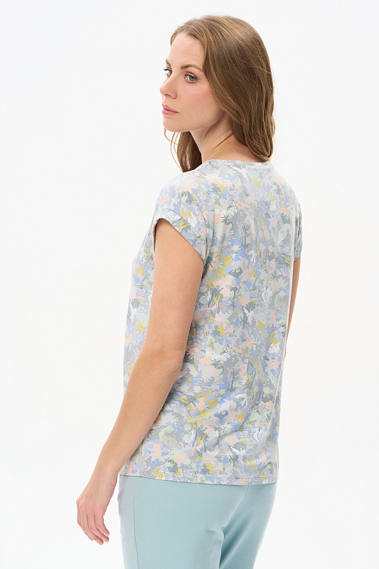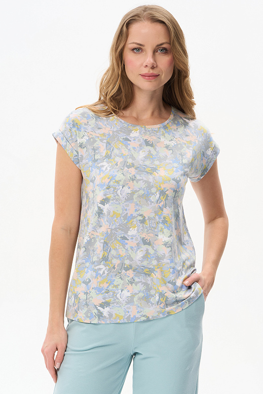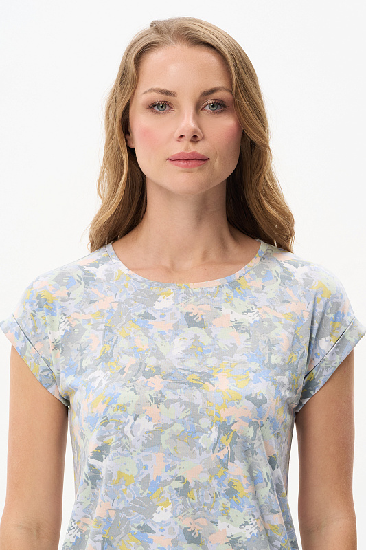 Футболка прямого силуэта из вискозного полотна с абстрактным принтом. Модель со спущеной линией плеча, цельнокроеные короткие рукава с зафиксированными подворотами, круглый вырез горловины, длиной чуть ниже середины бедер. Универсальная, комфортная модель на любой случай. Рост модели 175 см.